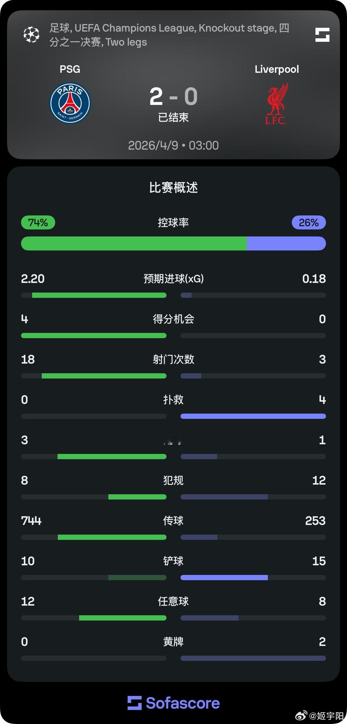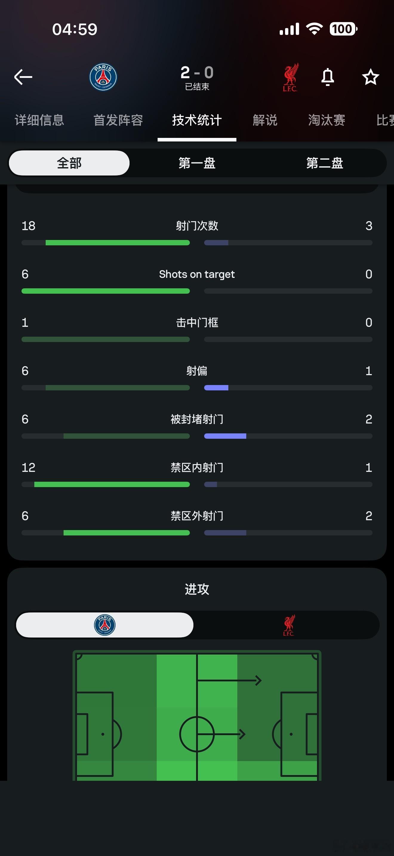 巴黎vs利物浦0比2,利物浦遭遇一场客场完败。射门次数18比3,射正次数更是 6 比 0。预期进球 XG 2.20 比 0.18。