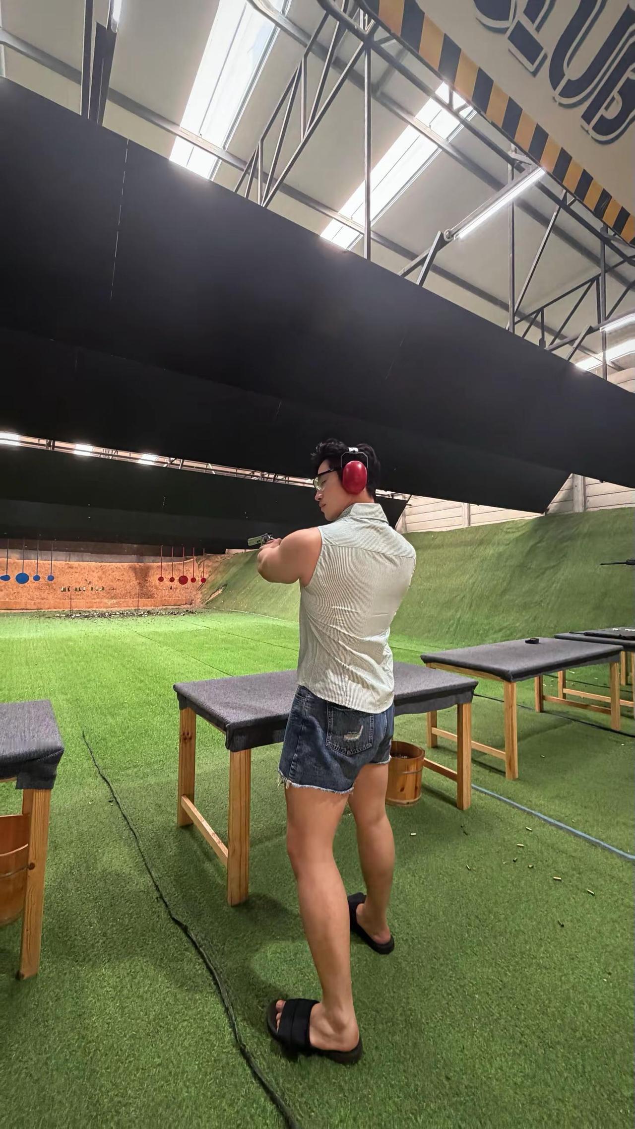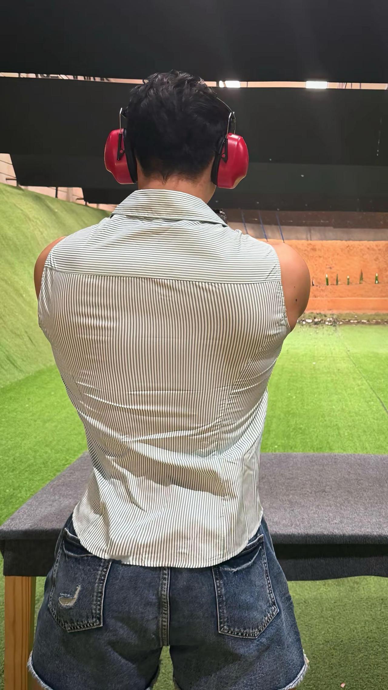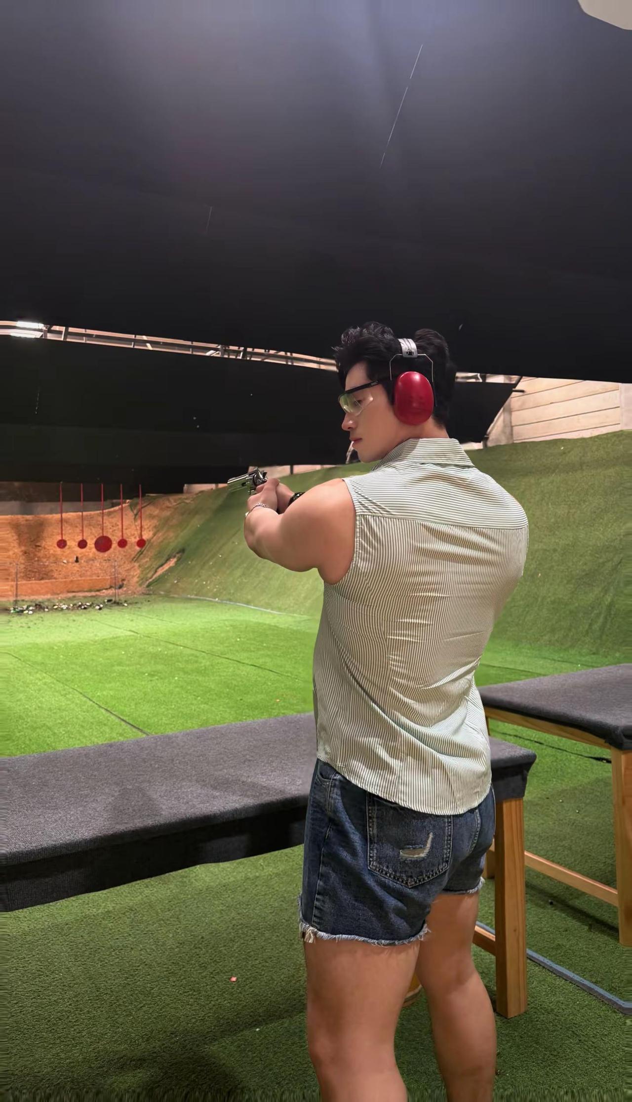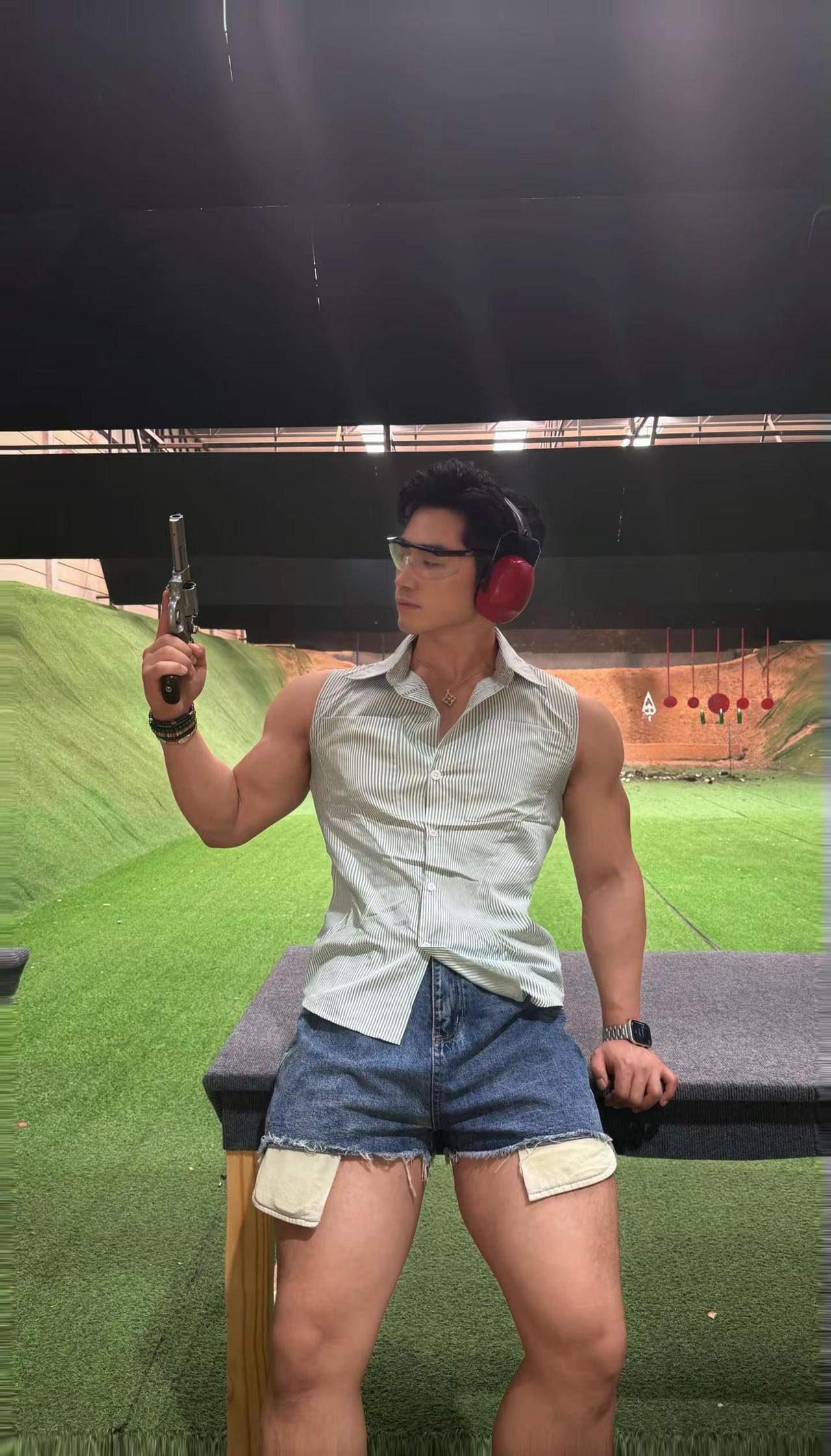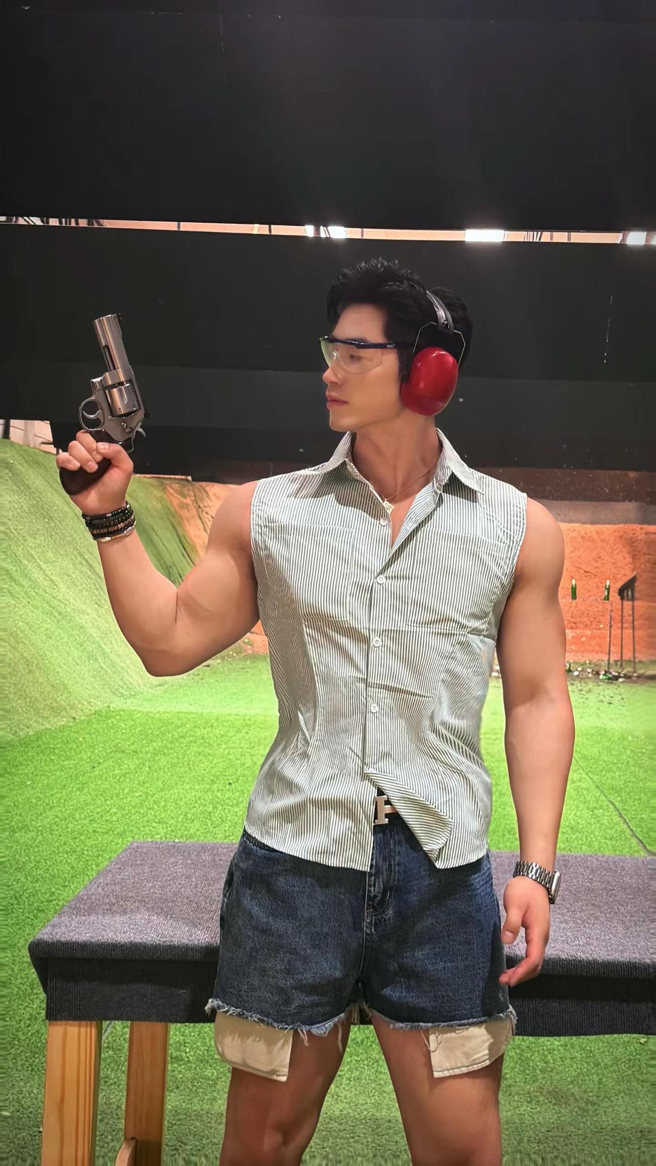 “拿枪要帅 开枪要快.”男生夏日穿搭 实弹射击 黄黑皮穿搭 健身穿搭