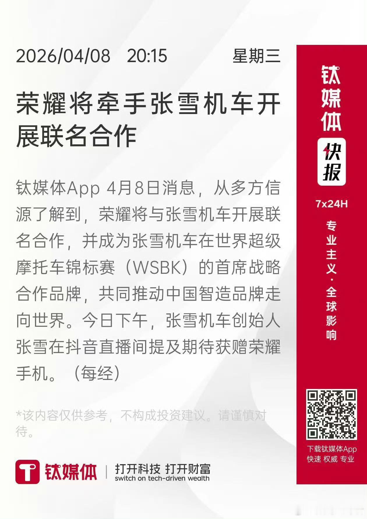 荣耀张雪机车战略合作 两家优秀的中国企业同频了!