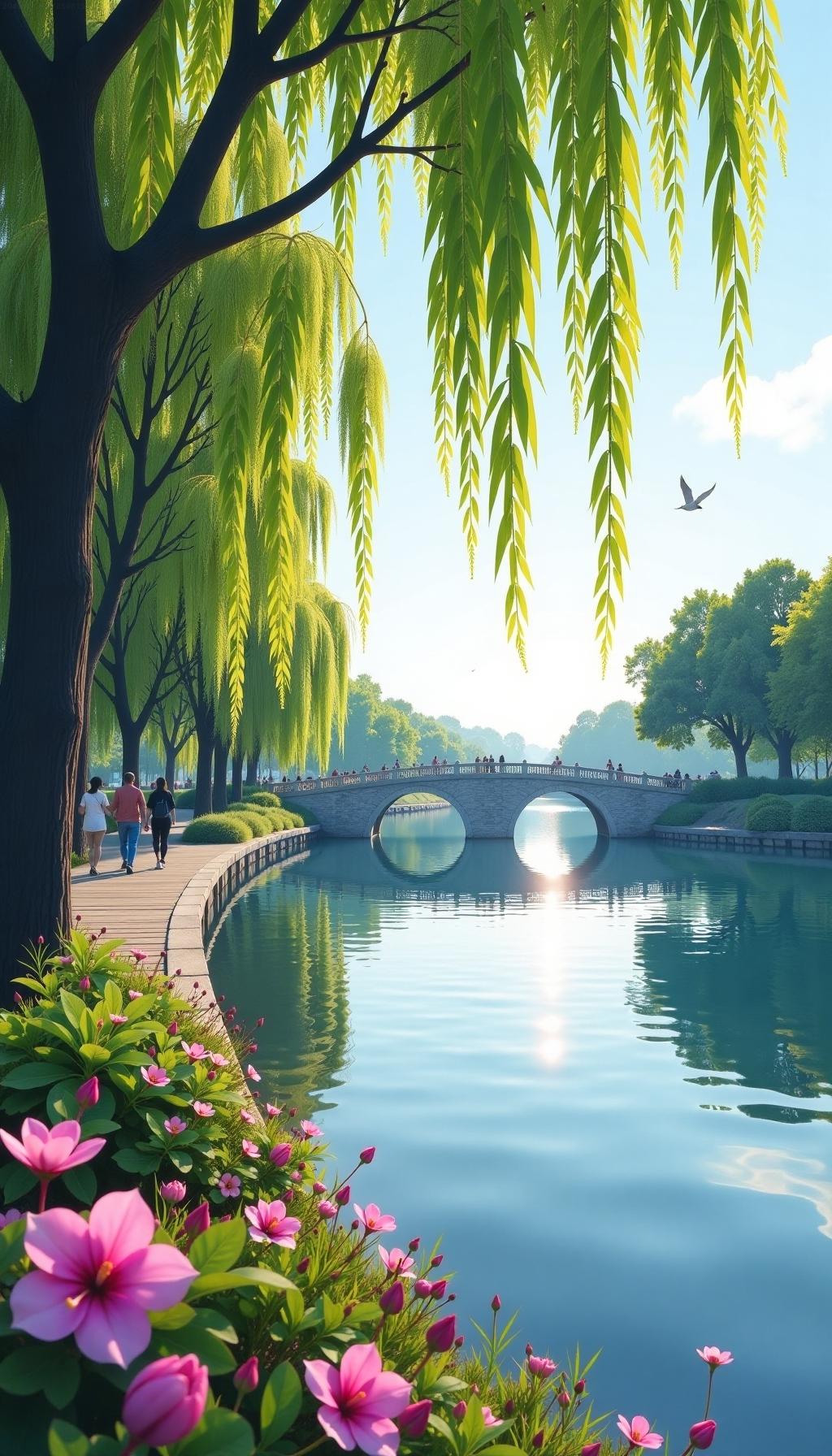 - 慢走散步,看柳丝轻扬,云影徘徊