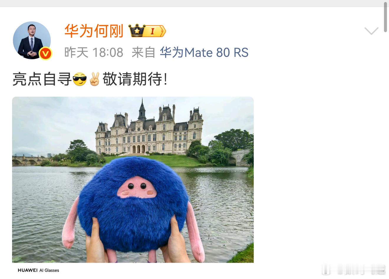 华为AI眼镜即将发布华为何刚总发布的微博:亮点自寻,敬请期待,从照片水印来看,印