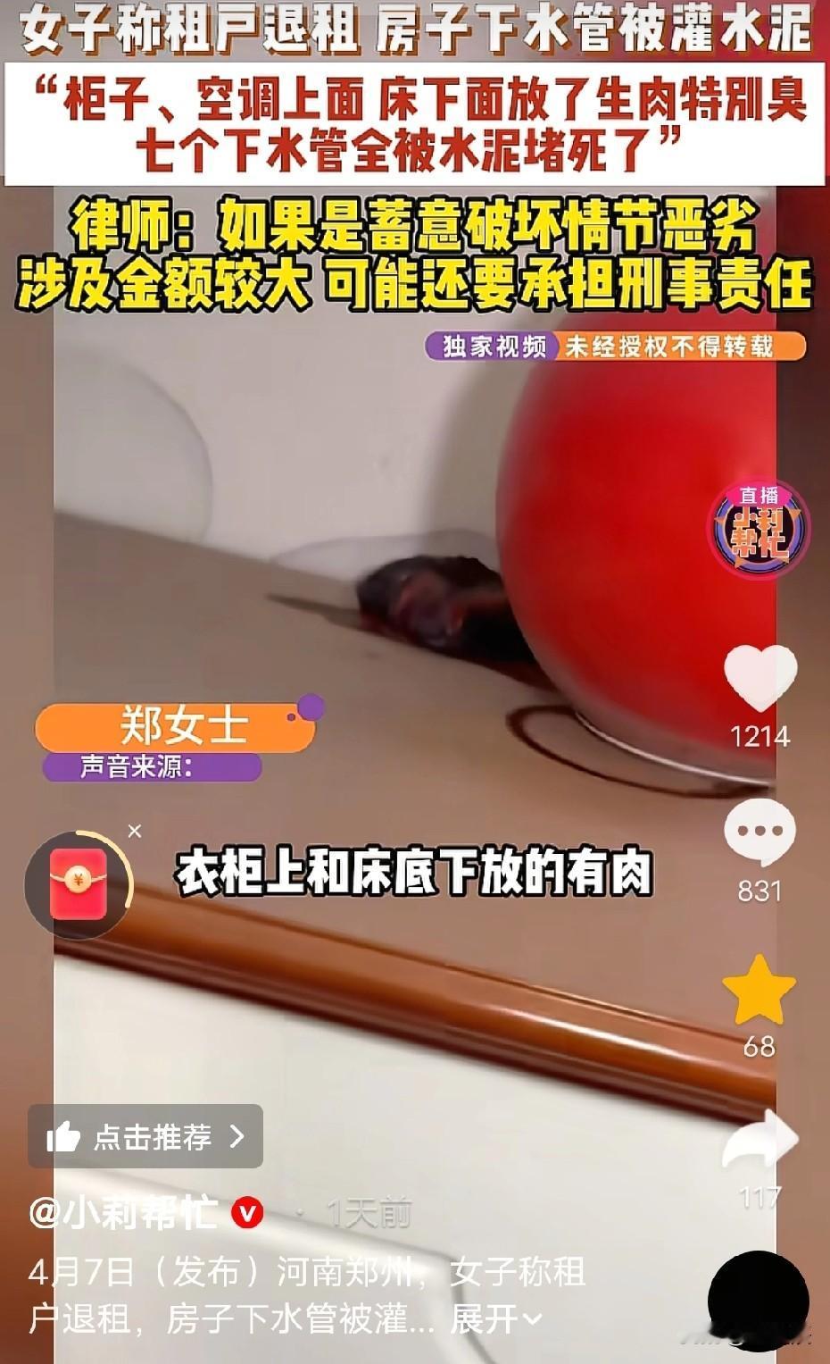 没办法,两天后郑女士委托家人上门处理,结果打开门吓了一跳。屋子里的几个洗手池、马桶、拖布池、厕所地漏等所有下水管道都被灌了水泥,严重损坏不能使用了。更恶心的是,女租户在离开房间时还在衣柜上、空调挂机上、卧室大床下面故意放了几块生猪肉,这几天温度高,猪肉已经发臭了,弄得整个屋子里下不去脚还腥臭不堪!