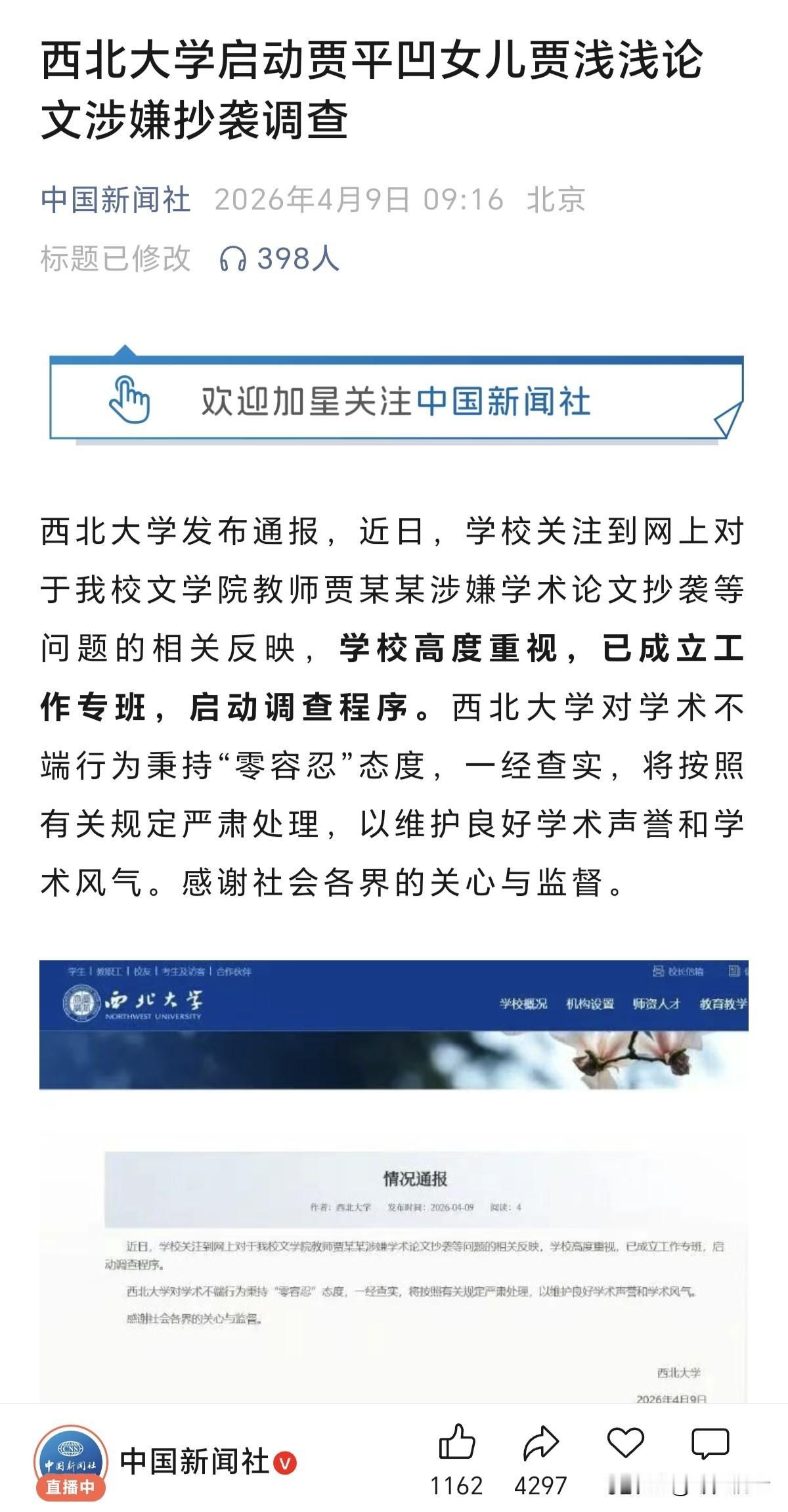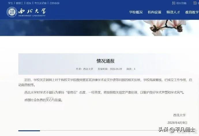 西北大学发布公告启动对贾某某论文涉嫌抄袭问题进行调查,就算不加“某某”,大众也知