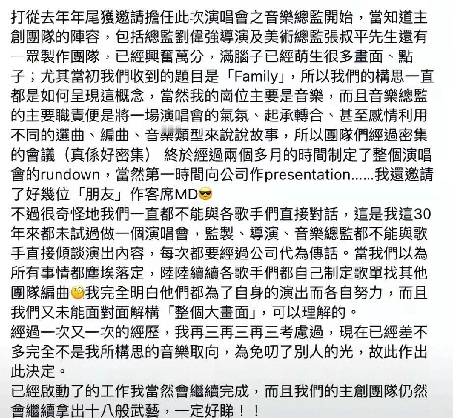 英皇斥资亿港元打造《25+英皇群星演唱会》,刘伟强、张叔平、王双骏强强联手,却突发内讧。4月9日凌晨,音乐总监王双骏发文请辞,怒揭入行30年首次遇奇葩状况:全程无法与歌手直接沟通,全靠公司传话。