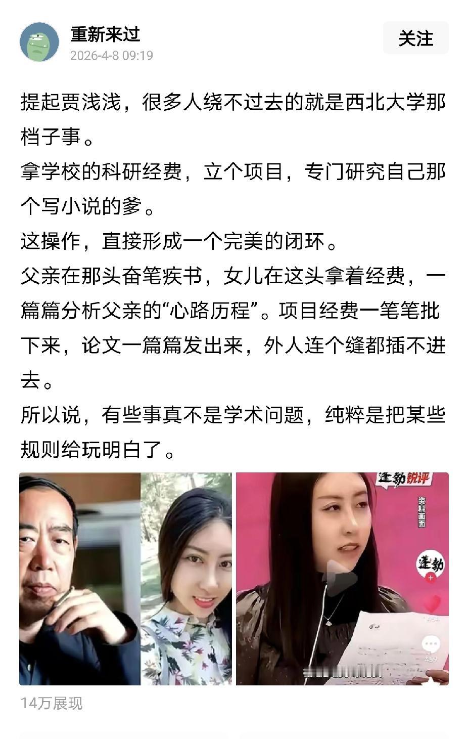 贾浅浅凭借父亲贾平凹的文坛地位,在学术成果存疑的情况下一路顺遂,此次调查彻底暴露了“学术拼爹”的弊端。