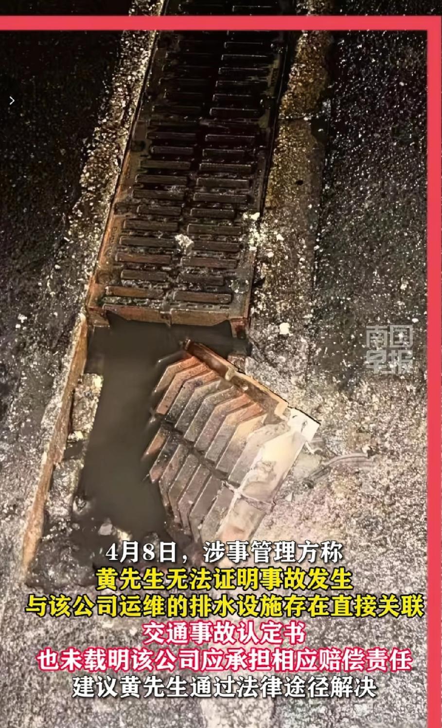 近日,南宁的黄先生驾驶新能源汽车途经清厢快速路西乡塘区路段时,疑因路面排水设施缺失,车辆底盘被刮擦,电池受损,造成数万元经济损失。责任争议:黄先生称交警判定他无责,认为排水设施管理方南宁北排排水管网运营管理有限公司应承担赔偿责任。而涉事管理方于4月8日表示,黄先生无法证明事故发生与该公司运维的排水设施存在直接关联,交通事故认定书也未载明该公司应承担赔偿责任,建议黄先生通过法律途径解决。(来源于@南国早报 )