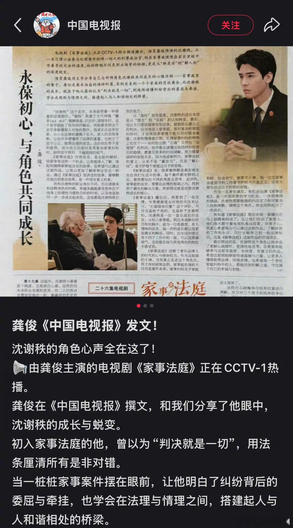 龚俊真的是闷声干大事!居然在中国电视报撰写了关于《家事法庭》里他对于沈谢秩的成长与蜕变的内容~俊俊文笔真的很不错,一整篇看下来对角色的理解很透彻,难怪演的很好!