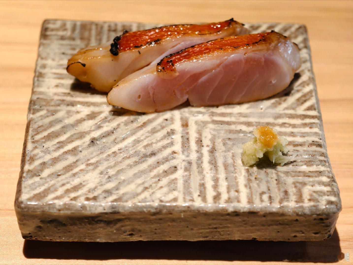 进入波澜壮阔的寿司环节,开场是图6热米饭鲷鱼,我还是第一次吃这样的鲷鱼寿司,一下子就有了非同寻常的感觉。图7是热米饭樱鳟,超级鲜嫩,真好吃,日本寿司基本不用鳟鱼,但是樱鳟是春季名物,品质非寻常可比,后来又加了一个,好吃到令人不知该如何形容,情不自禁的摇头晃脑。图8是乌贼姜汁酸米寿司,烤过的乌贼入口即化,太精彩了。