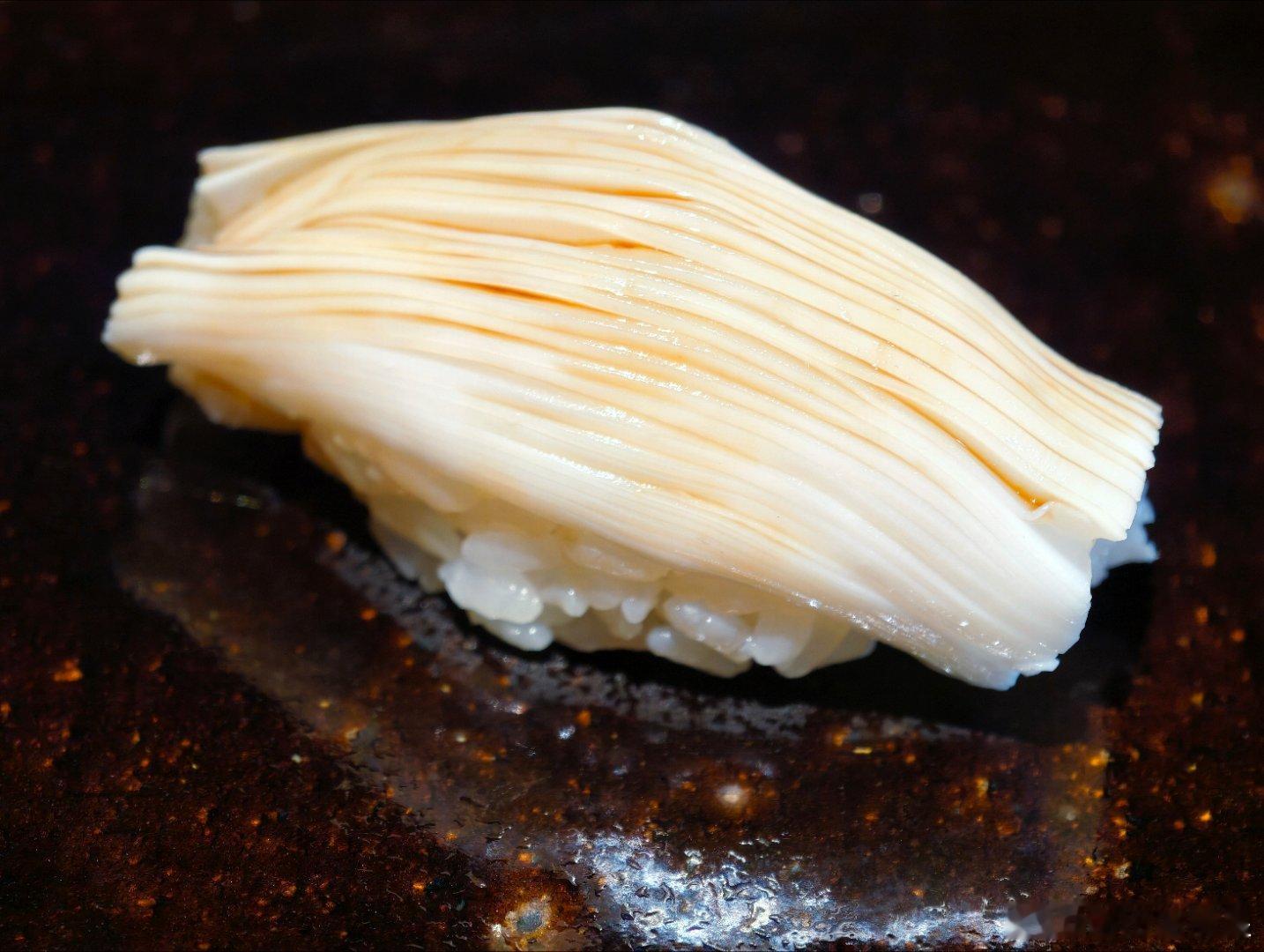 淡鲜的鸟贝寿司配烤鸟贝肝,我只拍了鸟贝,鸟贝肝忘记拍了。然后是鲜美至极的冷沙丁鱼寿司。在萤光乌贼冷寿司、干瓢手卷和味增汤之后、是甜口的鸡蛋寿司,这也是第一次吃。