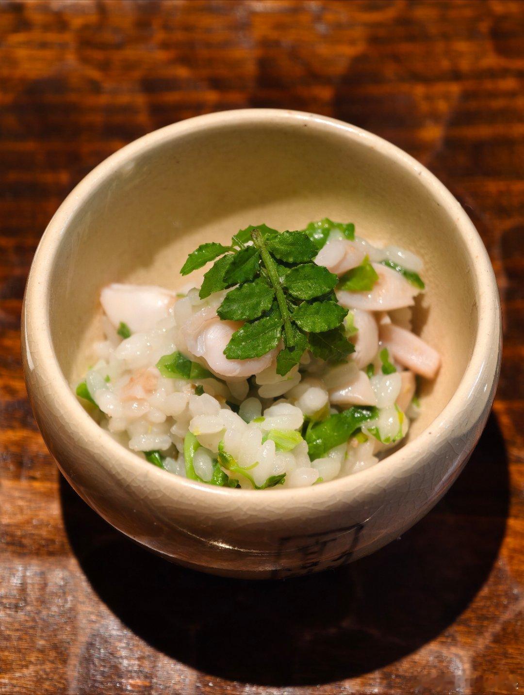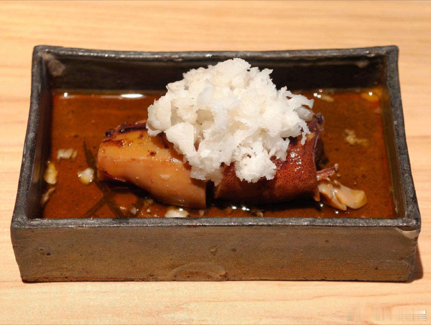 先是酒肴,图1是牡蛎意大利饭,鲜美。图2是盐烤金目鲷,咸鲜偏一点咸,现在正是金目鲷肥美的时节。图3是沙丁鱼卷包小葱和萝卜,鱼鲜加上葱香,还不错。图4是抱子乌贼和萝卜,浓油赤酱风格的菜。之后是一个咸甜口蔬菜卷。