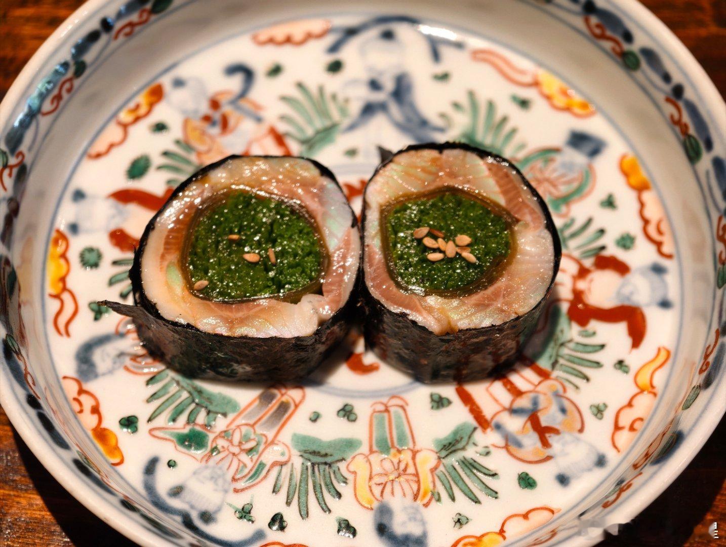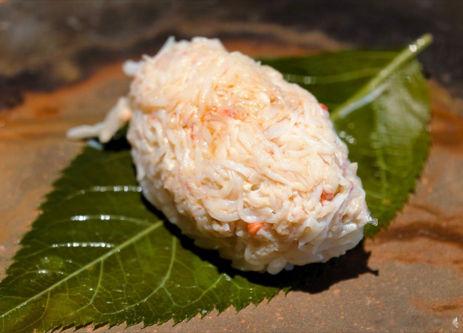 一碗鲜美的生蚝茶碗蒸之后,是金枪鱼中托罗寿司,虽说入口即化,但配的不是酱油而是盐,我还是第一次吃这种做法的。酸鱼小肌寿司一般,之后是撕碎的帆立贝寿司,口味鲜甜。一道冷焙茶之后是星鳗手卷,没什么特色,但之后的毛蟹寿司极为鲜香,入口温和,寿司放在叶子上,也有了叶子的味道。