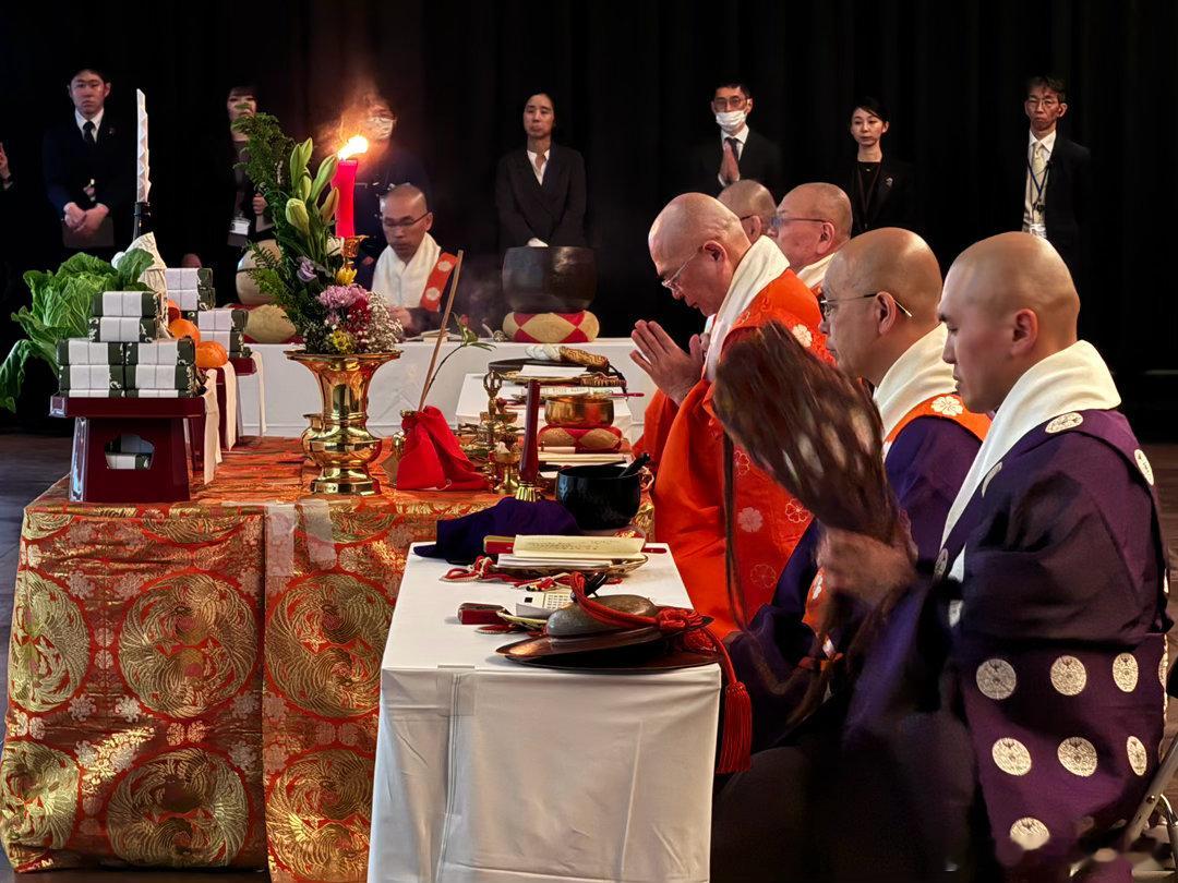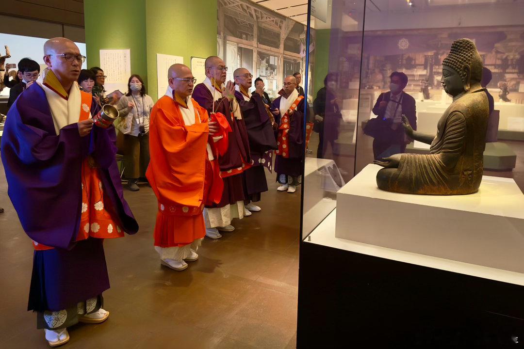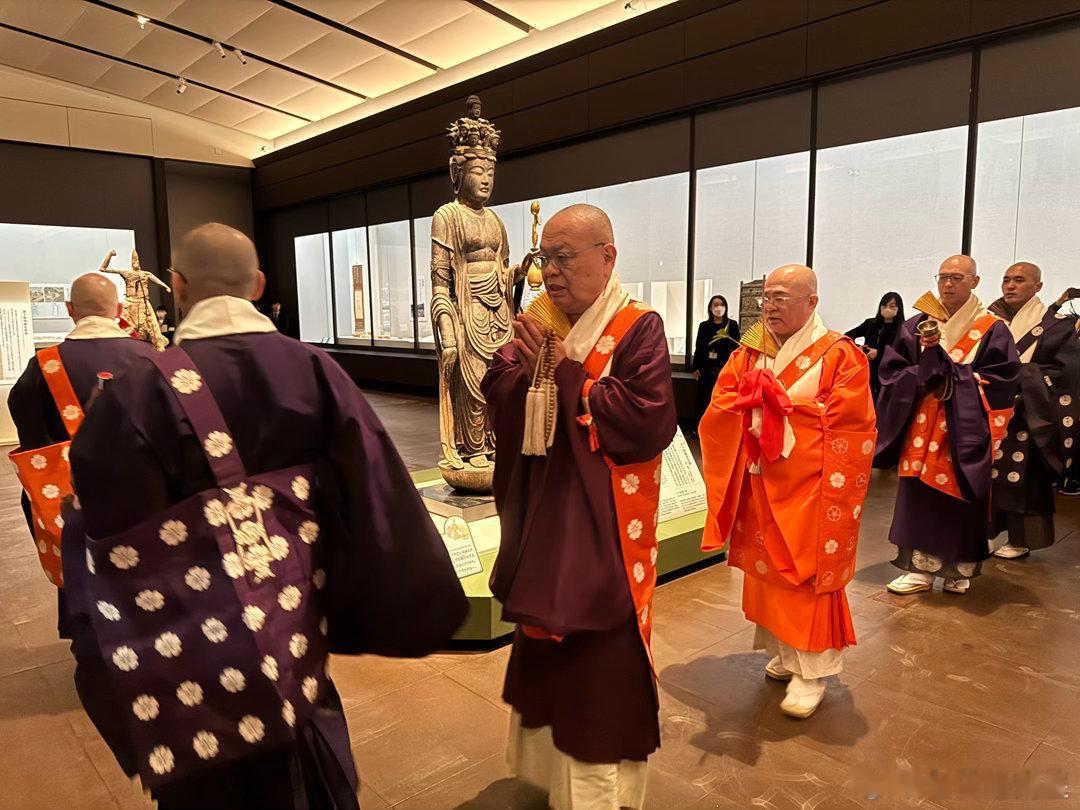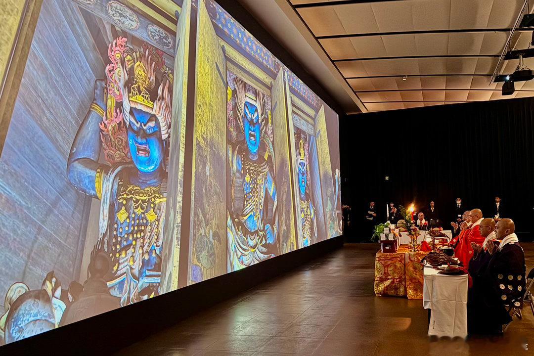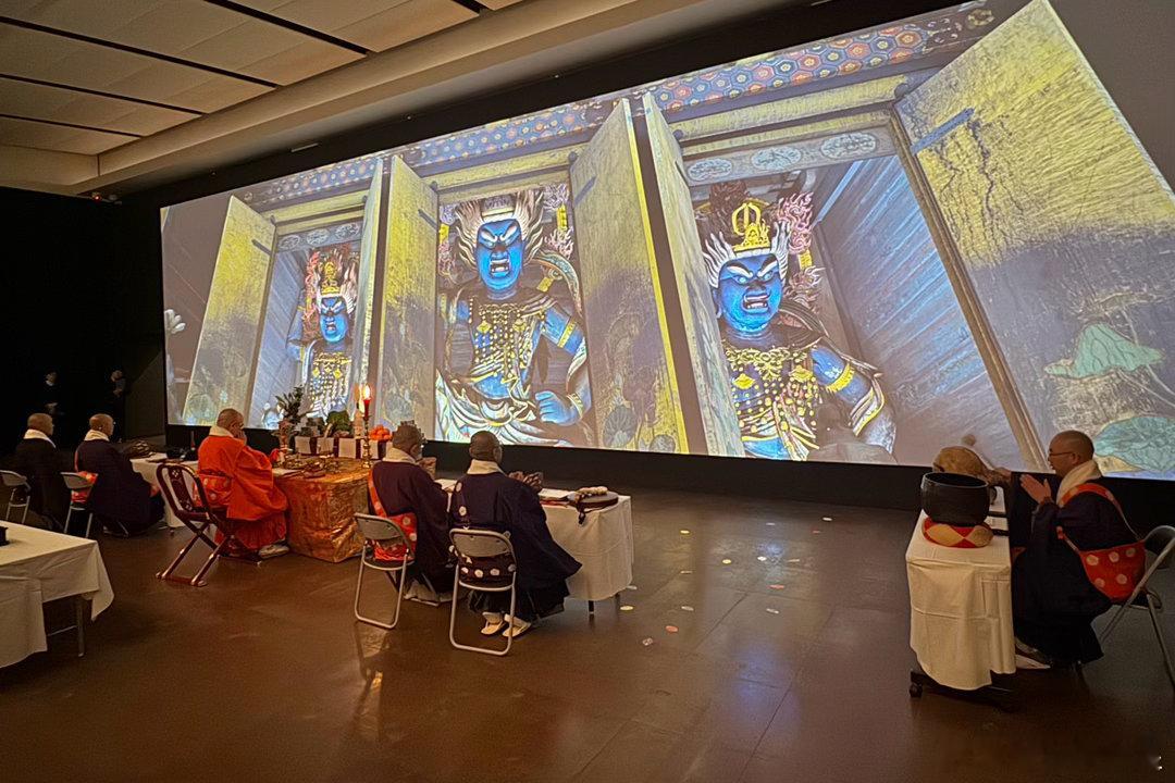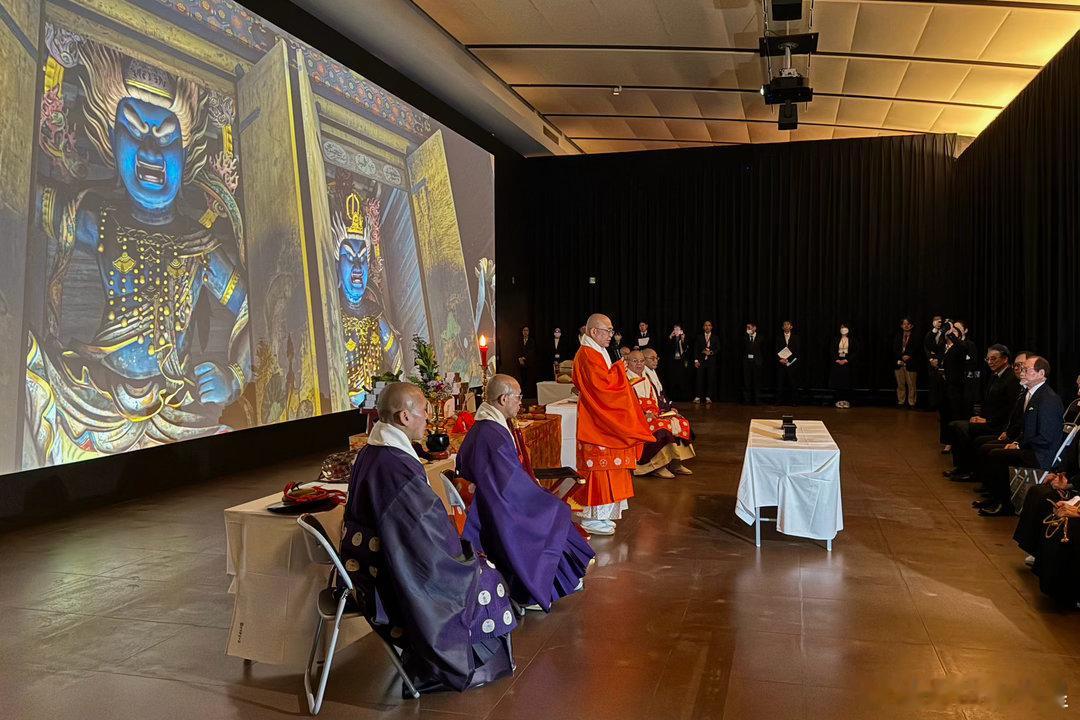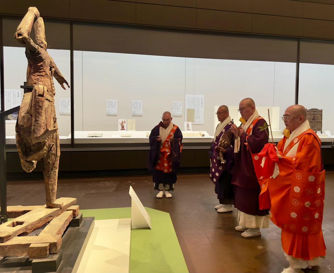 此次展览主打吉野山修验道的文物,金峰山寺方丈(宗务总长)田中利典在博物馆内的藏王权现屏幕前主持了法会,众僧高吹法螺,唱诵《妙法莲华经》、《般若心经》等经文,然后在展厅内巡回礼佛,仪式庄严肃穆。被陈列展示的古代文物,在这一刻真正活了起来,成了传承的纽带,成了信仰的寄托。