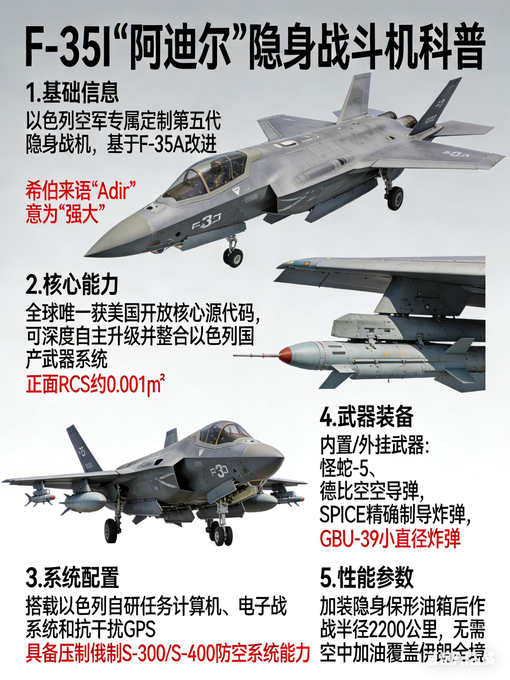 具备先进隐身设计(正面RCS约0.001㎡),搭载以色列自研任务计算机、电子战系统和抗干扰GPS,实现对俄制S-300/S-400防空系统的压制能力。