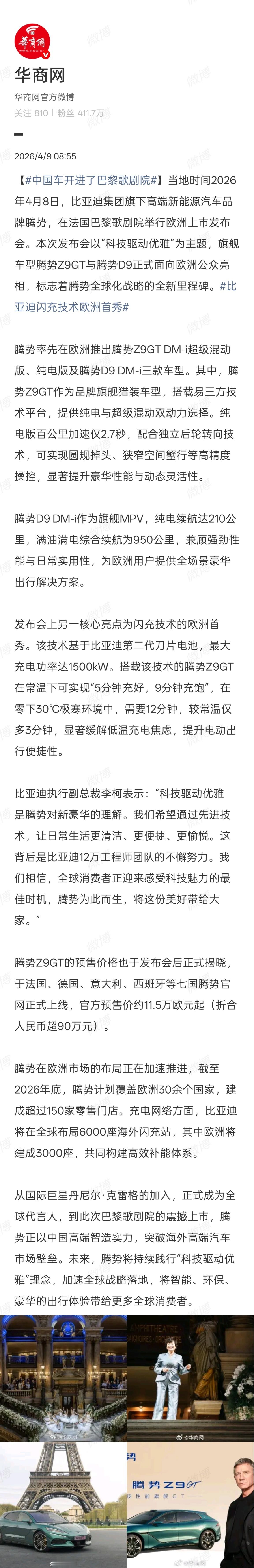当地时间4月8日,腾势在法国巴黎歌剧院举行欧洲上市发布会,以“科技驱动优雅”为主题,腾势Z9GT与腾势D9正式面向欧洲市场亮相。这不仅是腾势品牌进军欧洲的重要一步,也让中国高端新能源汽车以更自信的姿态站上欧洲豪华汽车舞台。