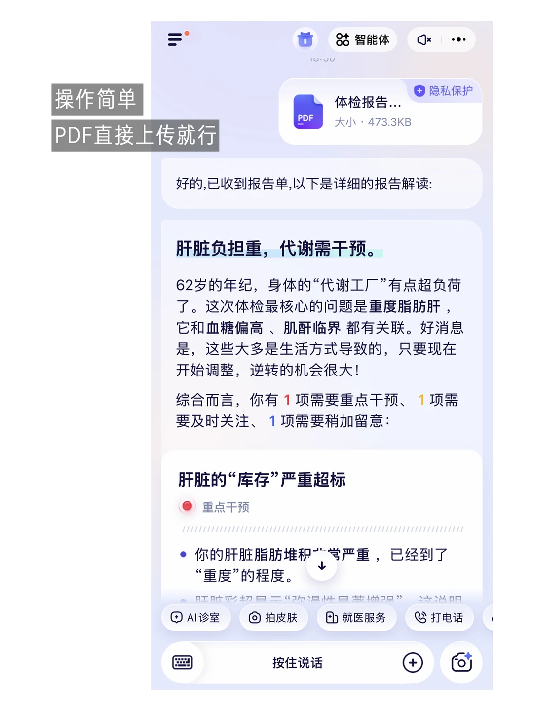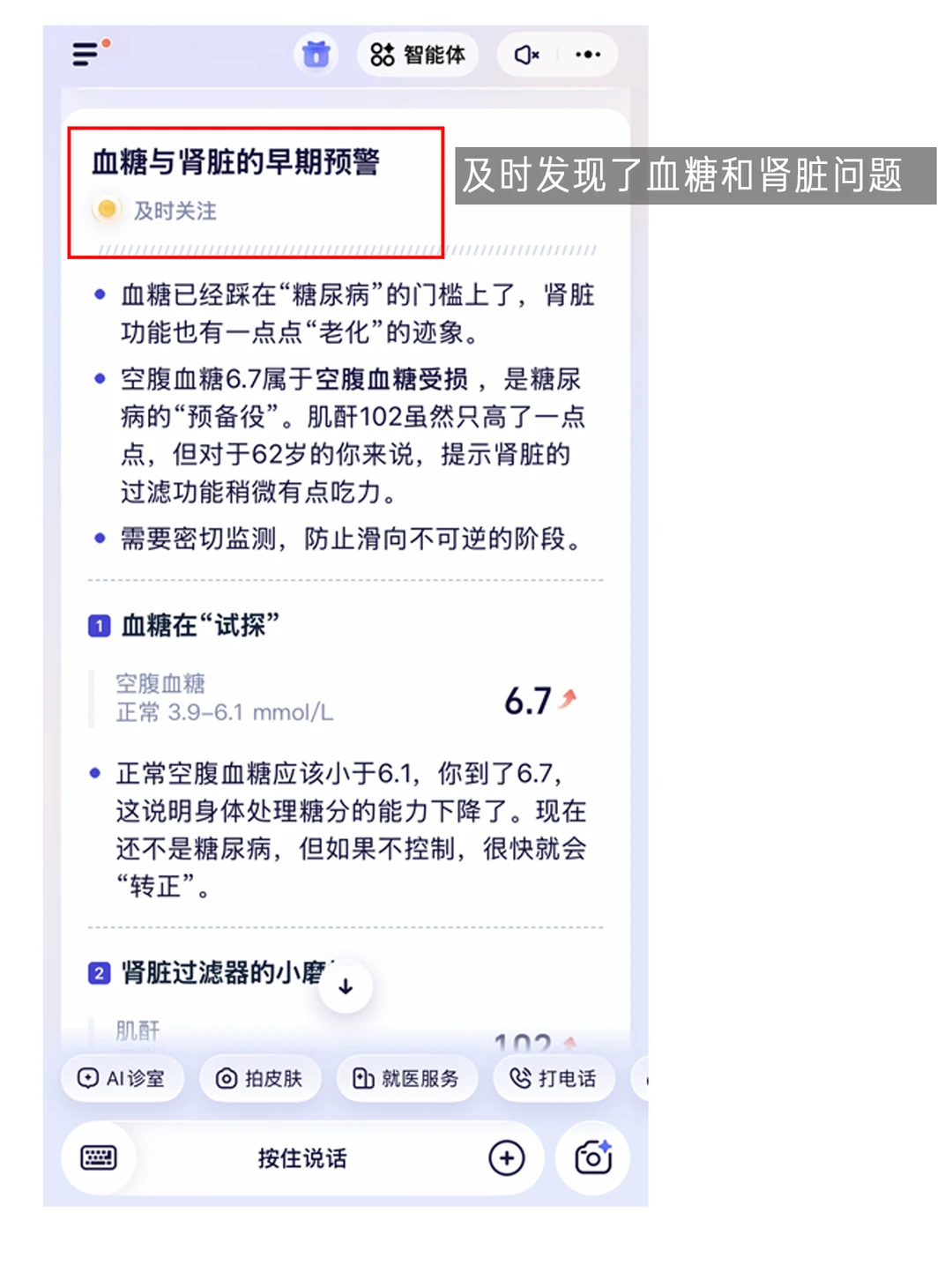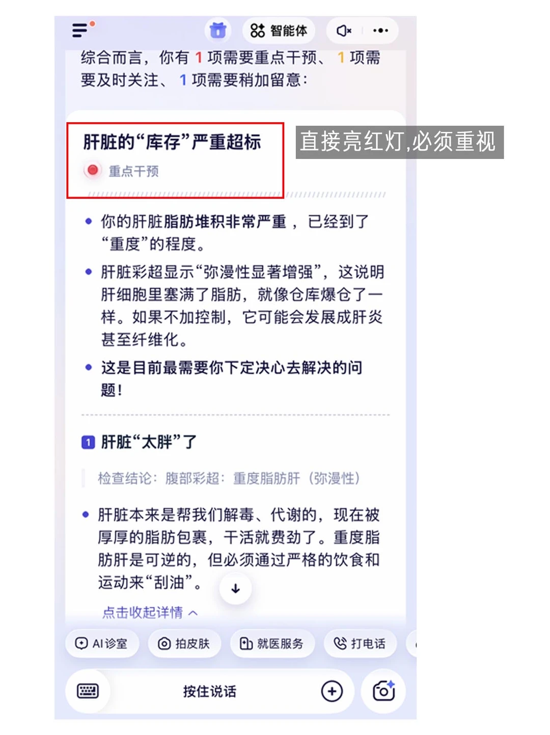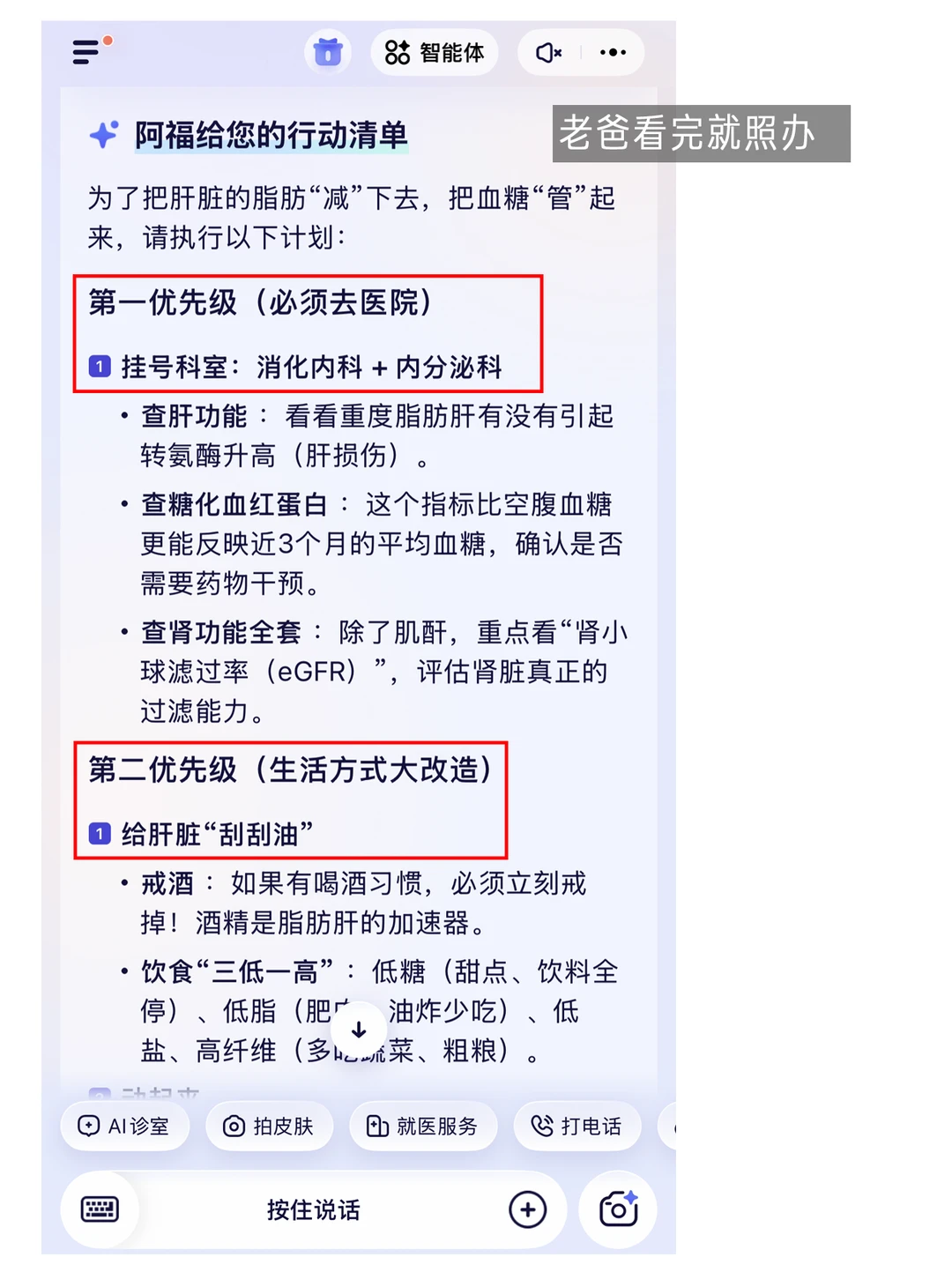 多亏了阿福,以前老头子总觉得脂肪肝“不算病”,阿福直接给他亮了红灯,还用黄灯提醒了他及时关注血糖和肾脏问题,这下餐后水果就更不能吃了!其实长辈不是不听话,是不知道那些“健康习惯”其实是大坑。