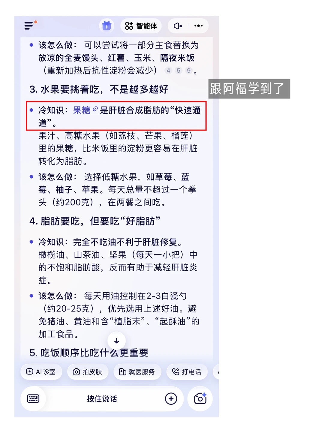 阿福甩出一个冷知识:果糖是肝脏合成脂肪的“快速通道”。对于脂肪肝患者,过量高糖水果的危害,可能比吃动物还大!
