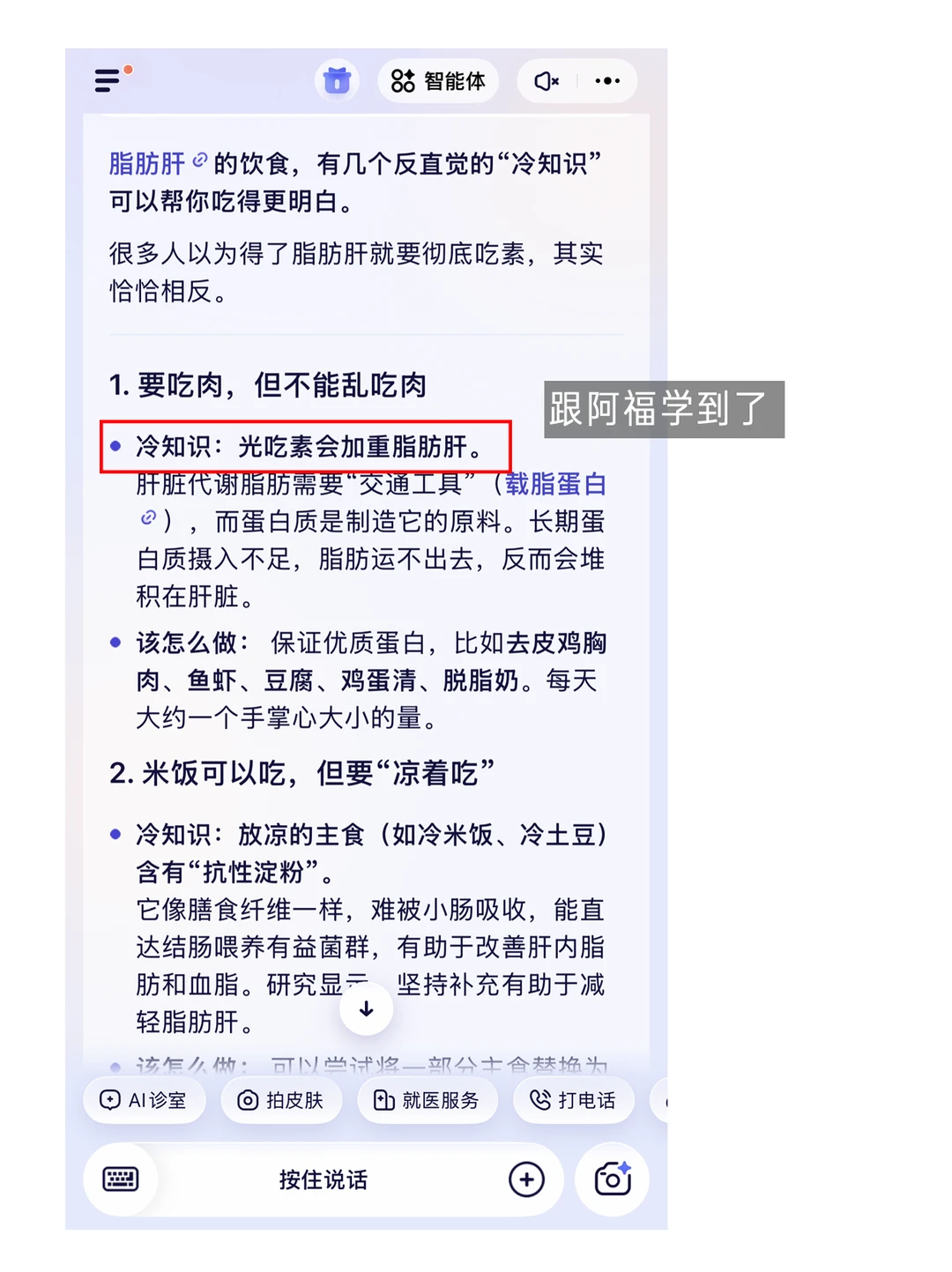 是不是略感意外?很多人都知道脂肪肝需要少吃肥肉、内脏,水果却很容易被忽视。这背后的原理,我就不展开了,有同款困惑的朋友,可以直接问阿福“关于脂肪肝可以吃的东西有哪些冷知识”。不过我建议,先把体检报告传给阿福,它分析完体检报告后,会给你更有针对性的建议。