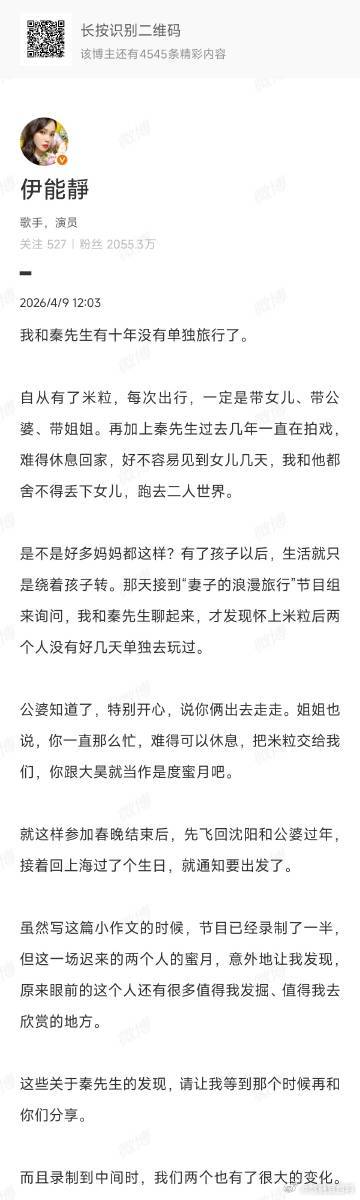伊能静从产后忧郁到自信 看完长文最大的感受就是,爱真的能抵御岁月的磨损。伊能静在产后那段敏感脆弱的日子里,一定也曾无数次渴望被看见。十年后的这场“重启蜜月”,不仅是补上了旅行,更是补上了对她个人价值的认可。现在的她谈起生活神采奕奕,那种骨子里透出来的自信和浪漫,才是女性最迷人的状态,秦昊这次真的做对了。