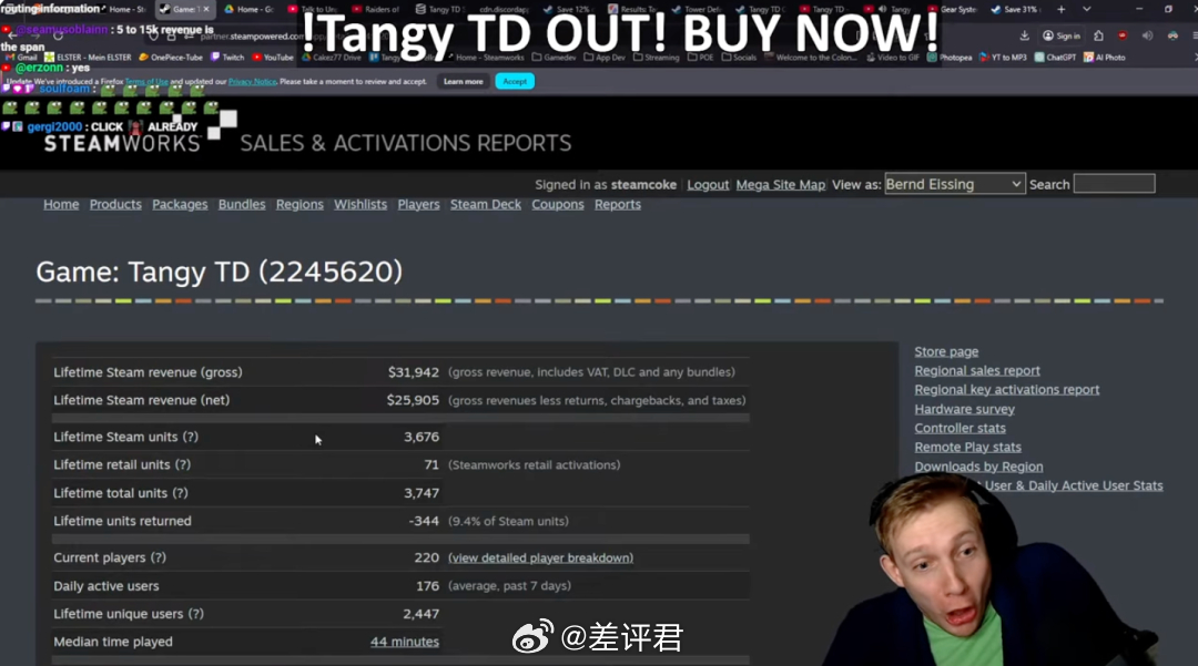 #独立游戏开发者卖出25万刀喜极而泣# 一个叫做 Cakez77 的德国普通独立游戏开发者,花了四年时间做了一个塔防游戏《Tangy TD》。在直播中,他打开Steam后台,看到销售额竟然有近25万美元的时候,直接泪洒直播间,和妻子紧紧相拥。说出花来,它也只是个塔防游戏,Cakez77 更不是什么名人,但为什么会有如此成绩?