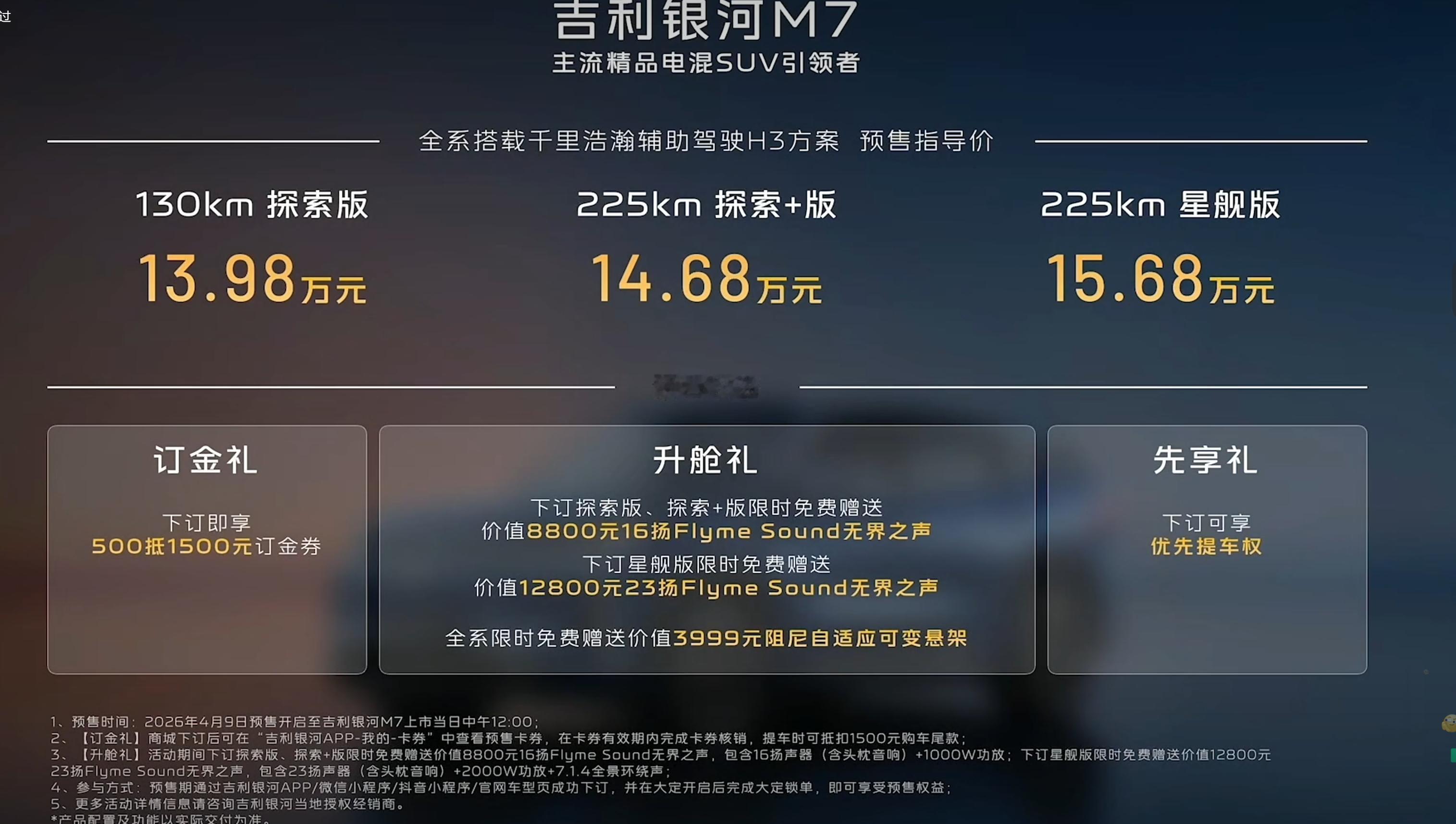 吉利银河 M7 首发搭载神盾金砖电池,以长续航为杀招切入主流电混SUV市场,推出 130km+225km 纯电续航组合,麋鹿测试成绩81km/h,比不少轿车都稳。而且全系标配辅助驾驶,现在预售已经开了。主流精品电混SUV引领者任贤齐认证的SUV