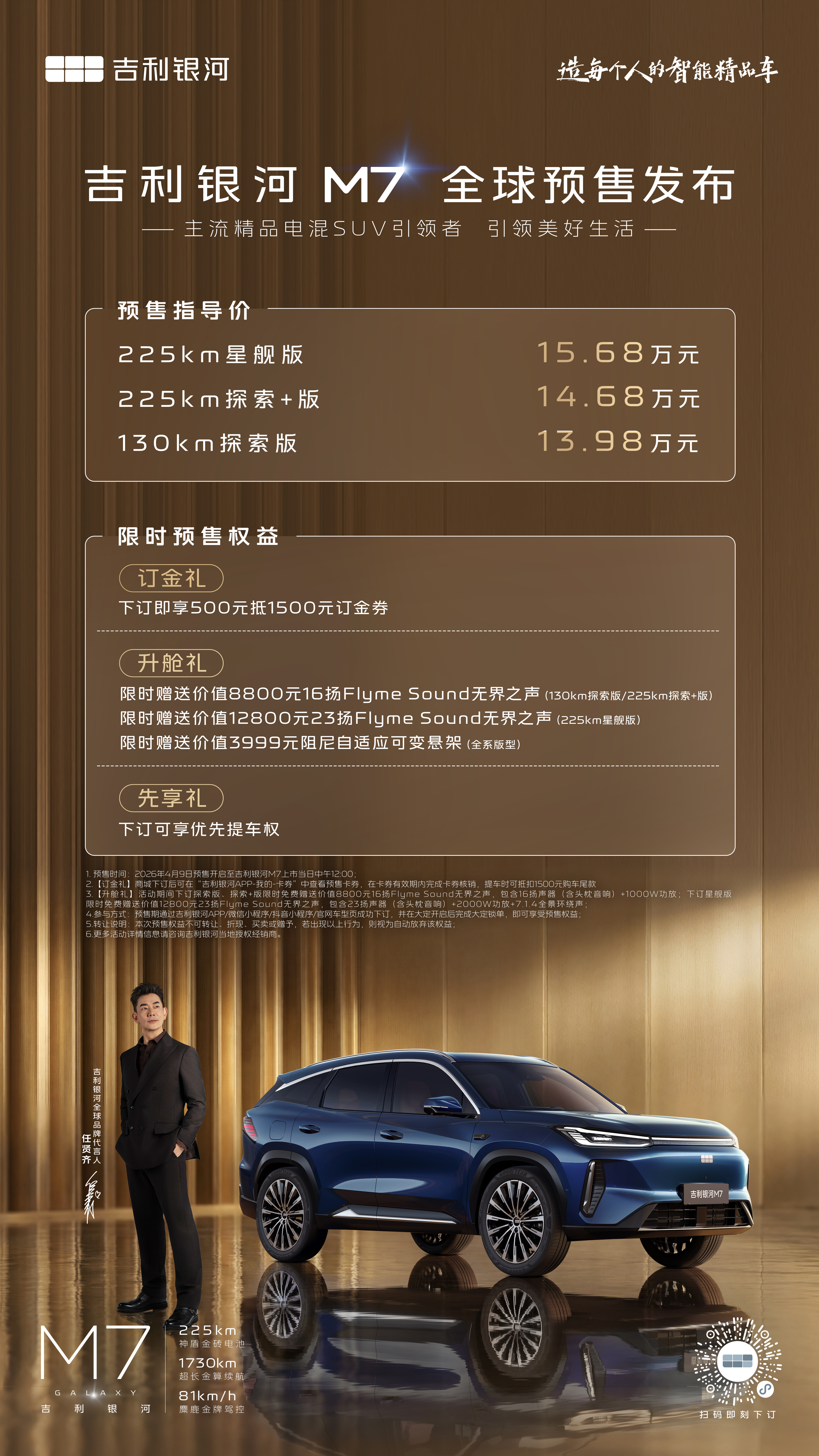 吉利银河M7预售价13.98万元起,首发搭载神盾金砖电池,电续航至高225km,满油满电综合续航1730km,麋鹿测试81km/h,对于新能源用户而言,续航焦虑、补能等待、电池衰减始终是绕不开的三大问题,吉利银河M7是奔着解决这些问题来的。主流精品电混SUV引领者任贤齐认证的SUV