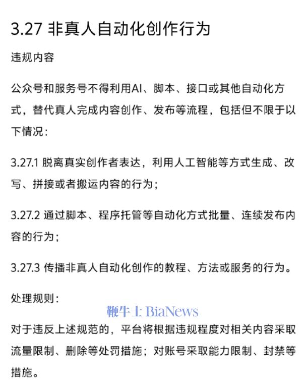 据悉,微信公众号近期已更新关于“非真人自动化创作行为”的平台规范。规则明确指出,公众号及服务号不得通过AI、脚本、接口或其他自动化方式替代真人完成内容创作或发布流程,不得传播非真人自动化创作的教程、方法或服务。违规内容将被限制或删除,相关账号也将面临能力限制乃至封禁处理。
