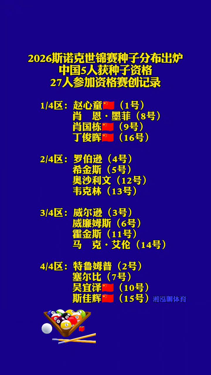 2026斯诺克世锦赛种子分布出炉,中国5人获种子资格,27人参加资格赛创记录。