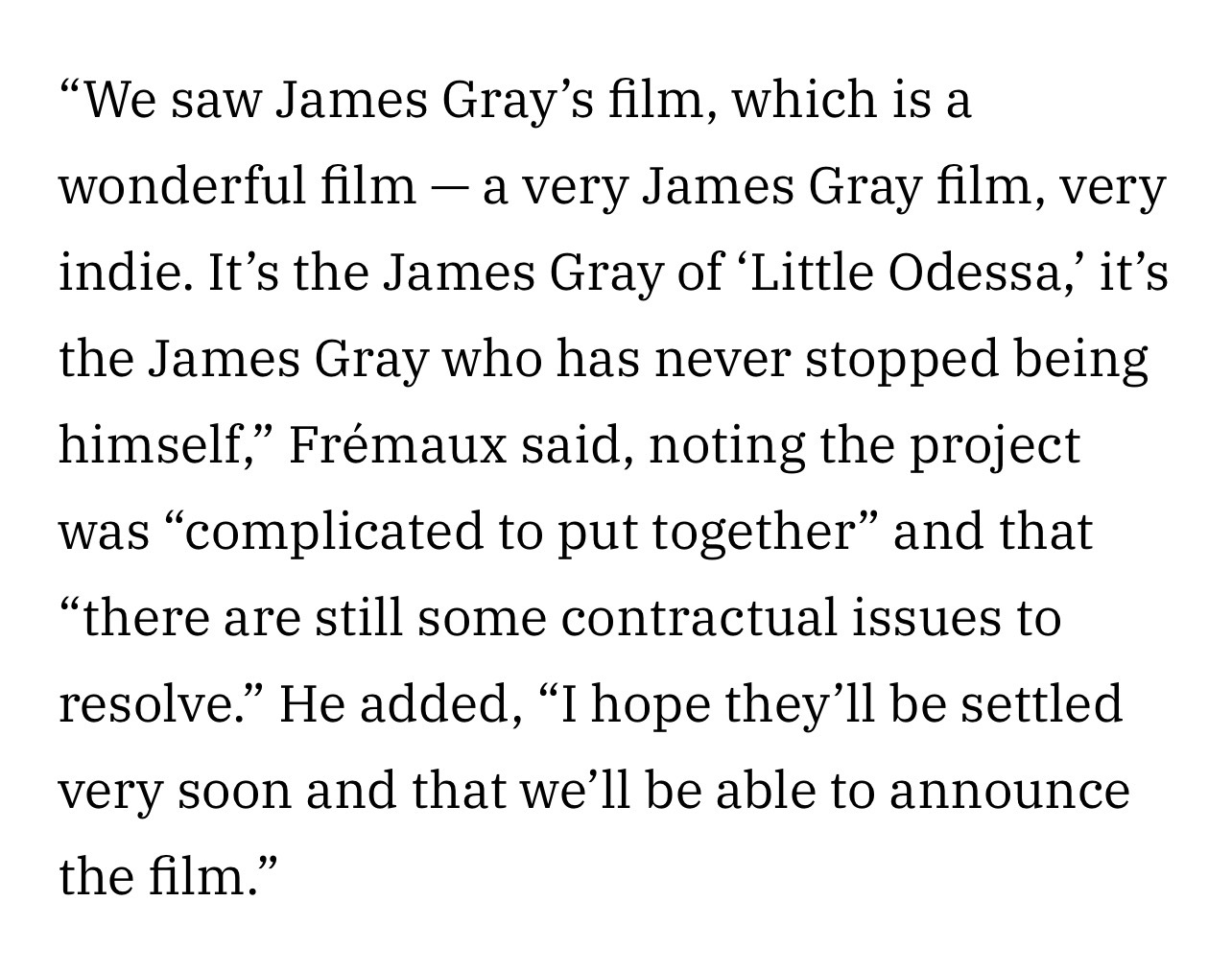 根据Variety消息,戛纳电影节艺术总监蒂耶里·福茂表示,正在争取詹姆斯·格雷执导,斯嘉丽·约翰逊、迈尔斯·特勒、亚当·德赖弗主演的新片《纸老虎》加入本届戛纳电影节。福茂接受采访时表示,格雷这部新片有一些合同问题需要解决,他正在努力争取这部新片能够入围,同时福茂也称赞这部影片非常精彩。