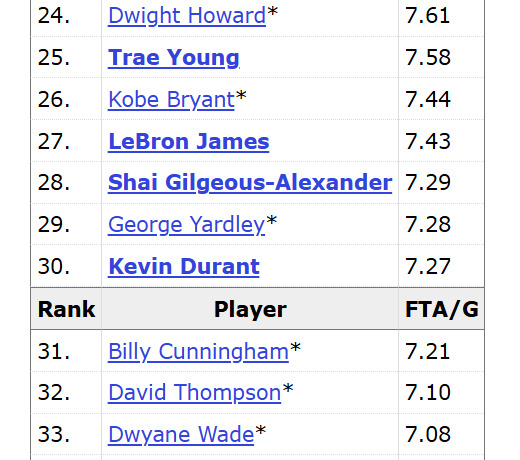 已经连续7个赛季场均罚球不超过6个的詹姆斯,生涯场均罚球已经掉到历史第27位,场均7.43个,退役前估计还得掉。