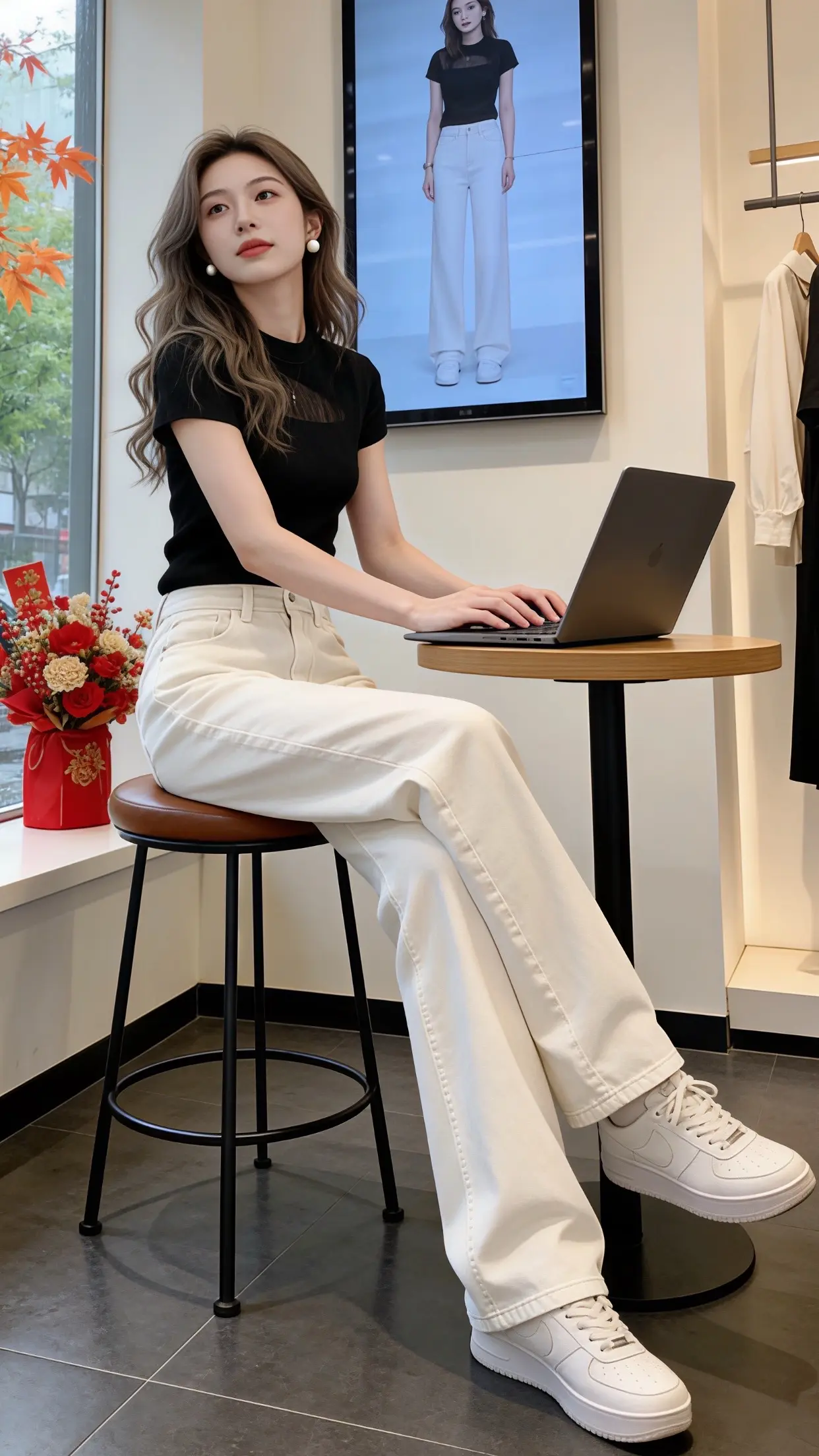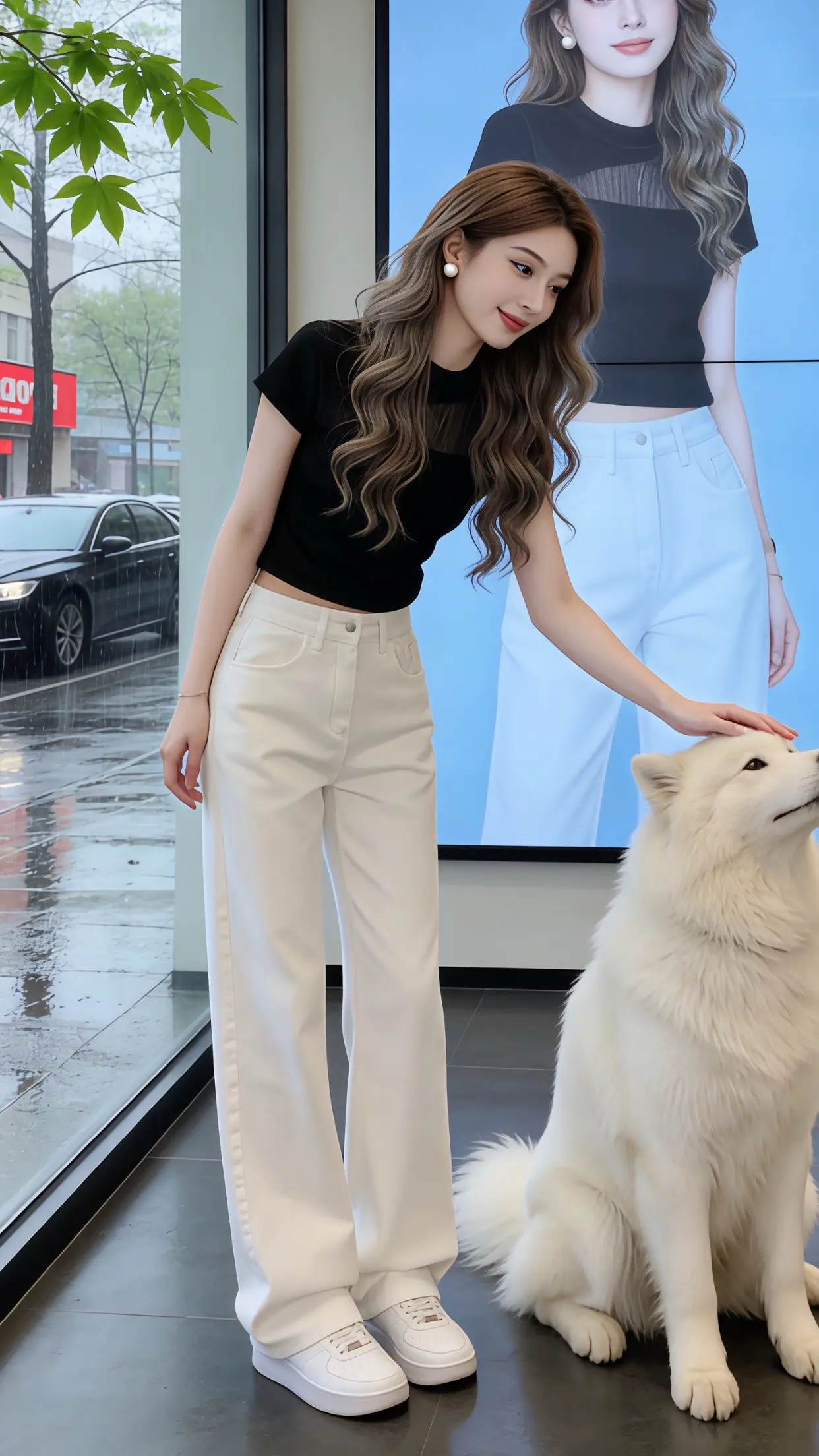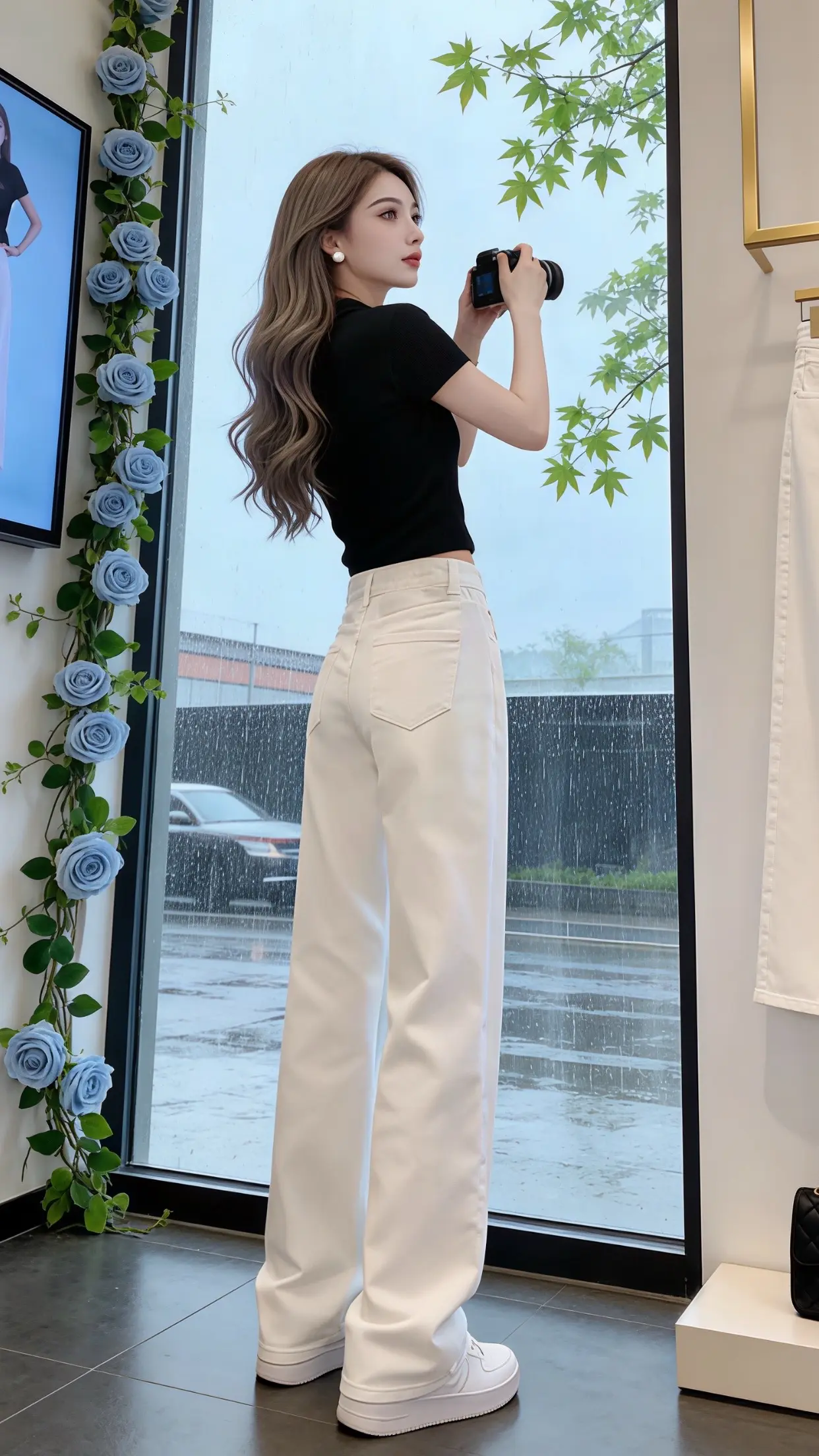 雨后的石板路泛着清润的光,她就站在那里,一身浅蓝色喇叭牛仔裤,把利落与温柔揉得刚
