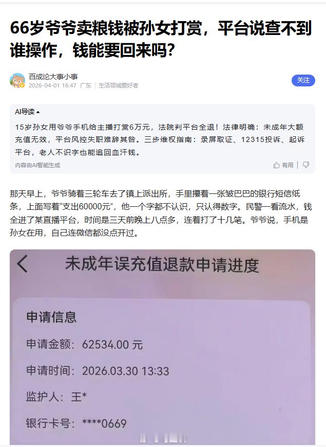 爷爷卖16000个烧饼孙女打赏给主播未成年人打赏能退回吗