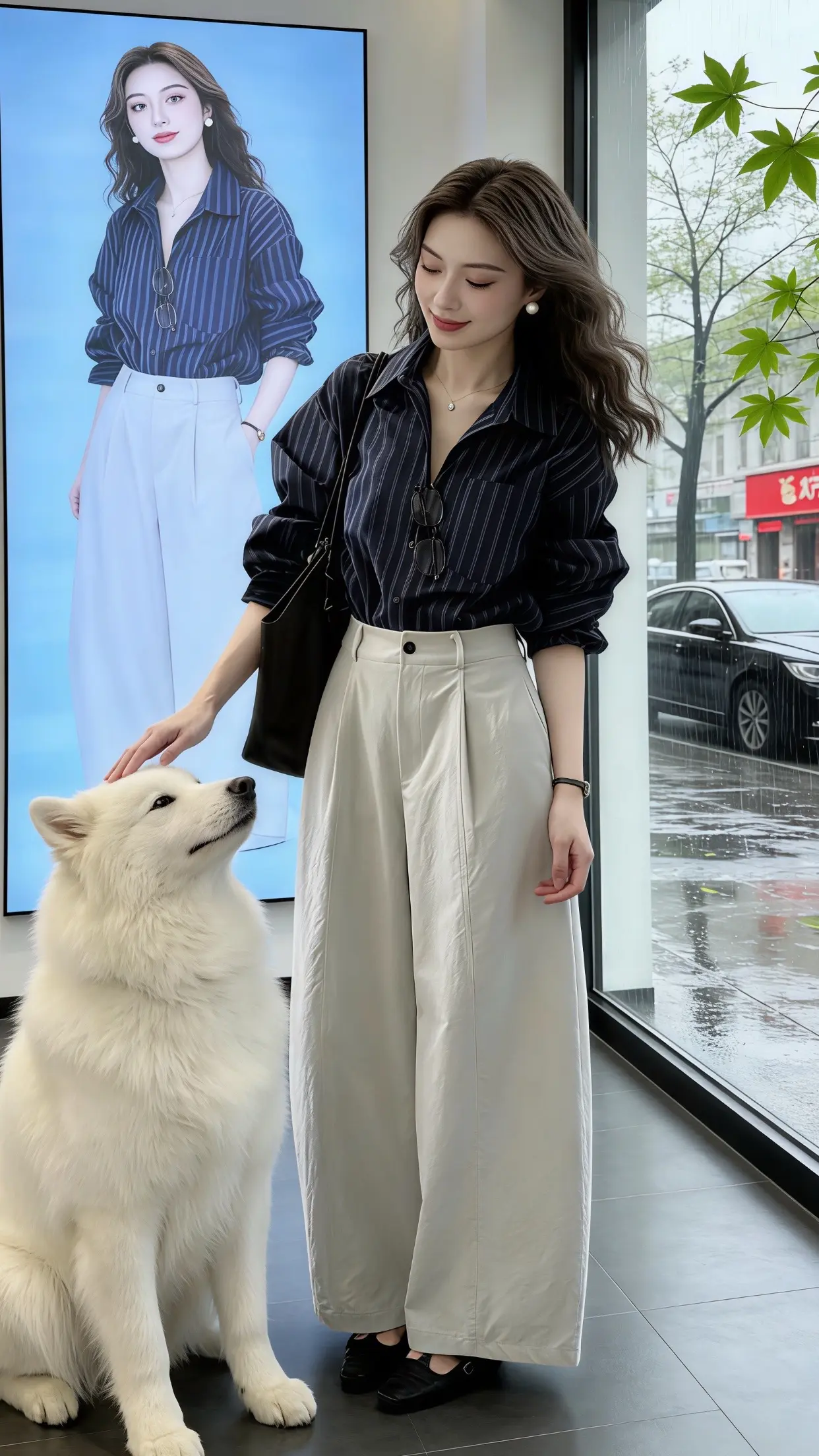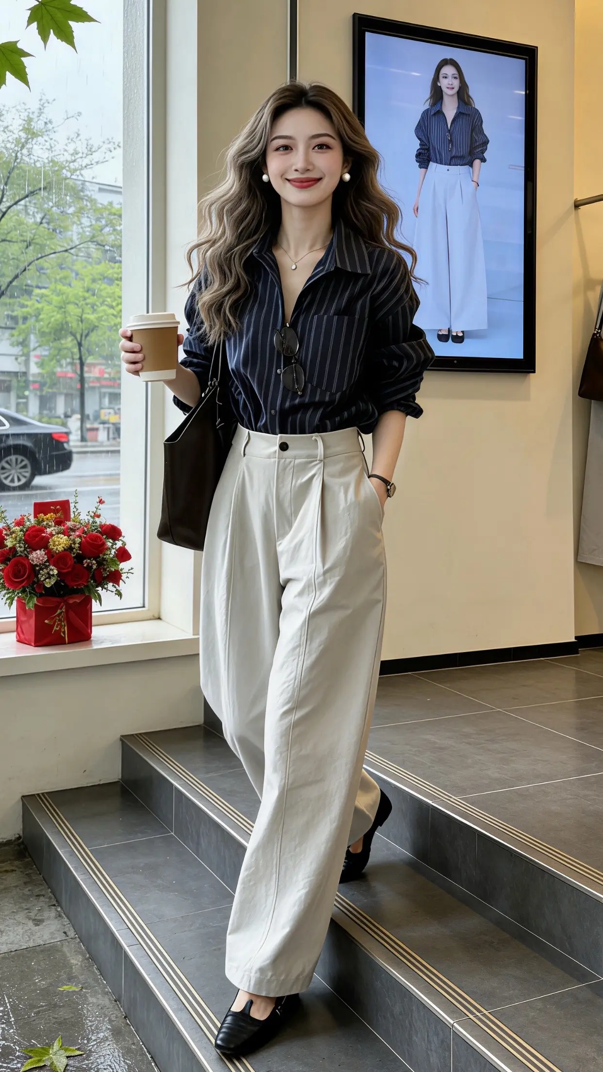 雨后的石板路泛着清润的光,她就站在那里,一身浅蓝色喇叭牛仔裤,把利落与温柔揉得刚