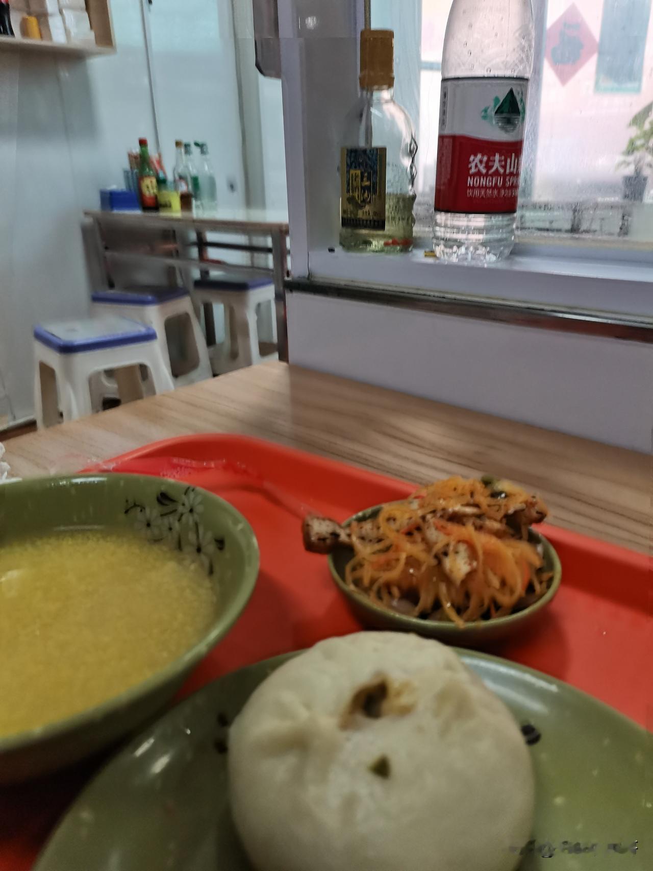 周五早上七点的丹东早餐店略微显得空荡,屋里四个人,一个顾客三个服务员。这个时间不是吃早餐的时间吗?可能有点晚了吧。一碗小碴粥,两个辣椒猪肉馅包子外加一小碟咸菜,收费七元。这价格咋样
