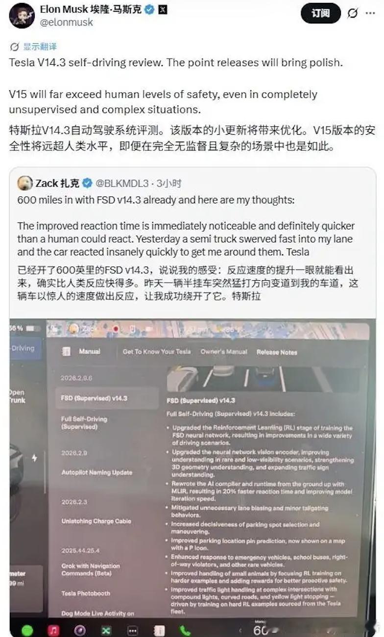 早在 2025 年 8 月,马斯克就曾表示 FSD V14 版本的驾驶表现将优于人类司机,而 V15 版本则有望实现比人类驾驶好 10 倍的水平。