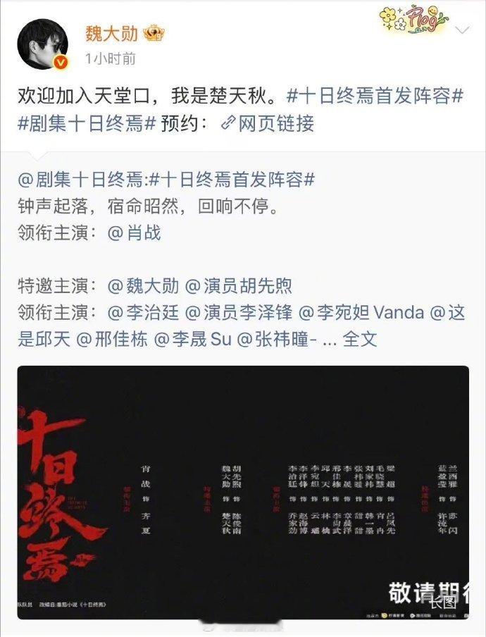 魏大勋官宣出演楚天秋 谁懂这种惊艳!魏大勋官宣楚天秋,金丝眼镜西装,破碎感与气场双在线。 十日终焉