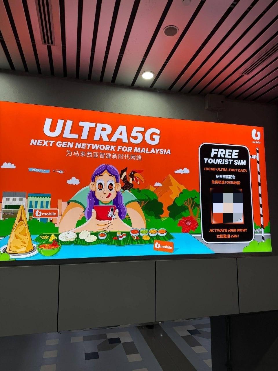 而且,最近很有意思的是,如果你是刚到马来西亚的旅客,U Mobile还为旅客提供了免费100G的数据流量卡,通过扫码即可使用,可供用户在落地未购买当地电话卡的情况下临时使用。