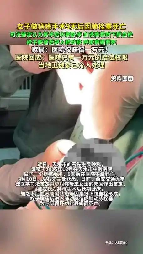 人命大于天,医疗救治容不得半分差池。2025年12月,甘肃天水市61岁王女士,受痔疮病痛困扰,前往天水市中医医院接受手术。寻常肛肠手术,在大众认知中风险极低。家属满怀期许,盼老人术后康复。天有不测风云,术后仅9天,王女士骤然离世。鲜活生命骤然消逝,家属悲痛欲绝,满心疑惑无处诉说。