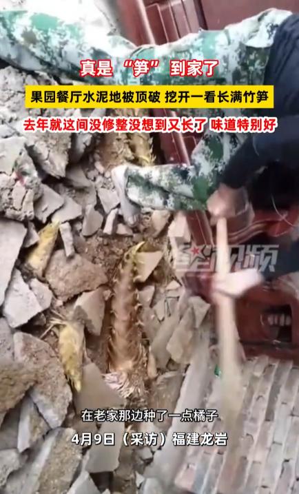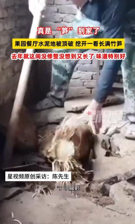 意外之喜,真是 “笋” 到家了!果园餐厅水泥地被顶破,挖开一看长满竹笋。这到底是寓意要发财,还是要破财呀?