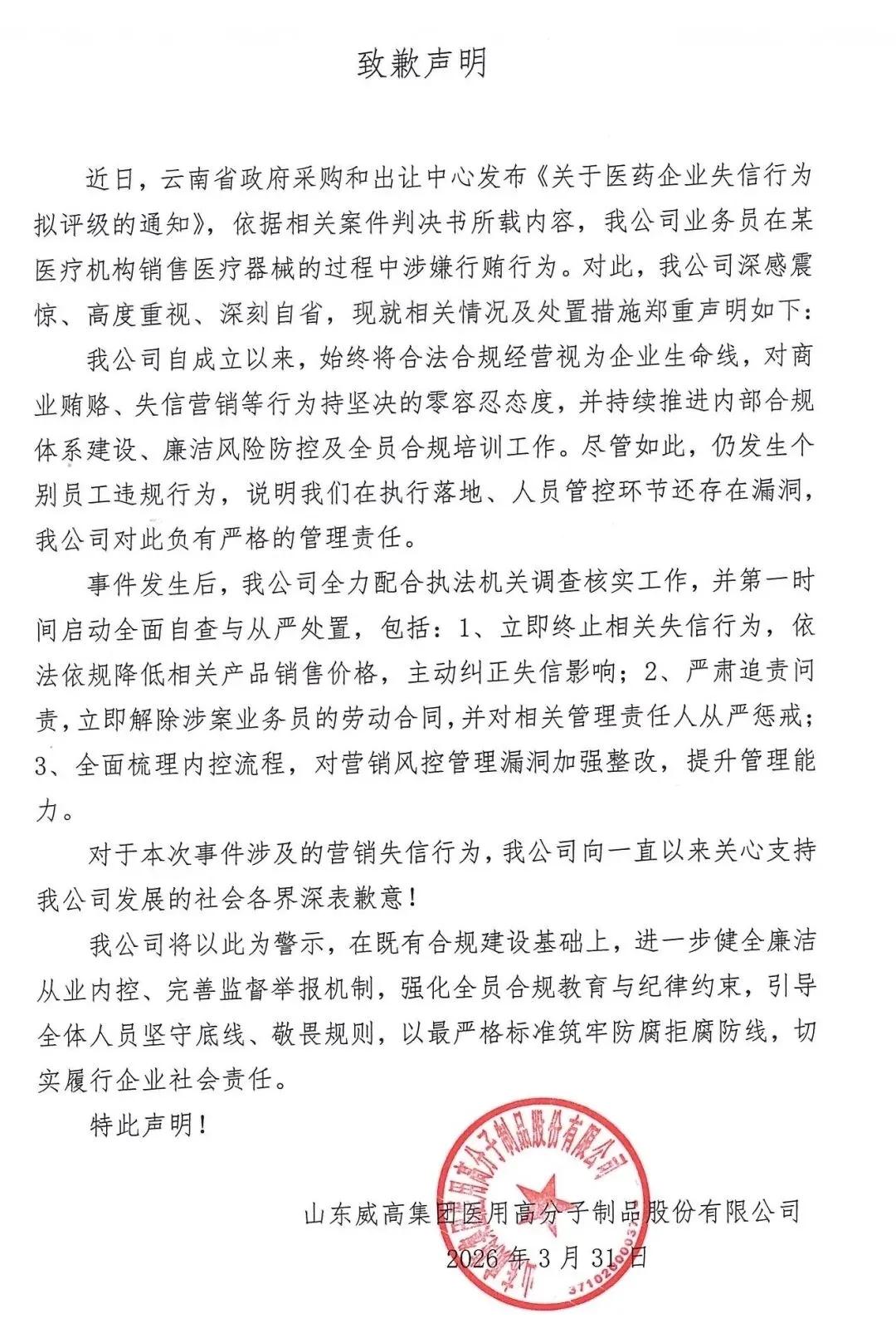 【业务员在销售过程涉嫌行贿,云南省医疗保障局发布威高股份致歉声明】