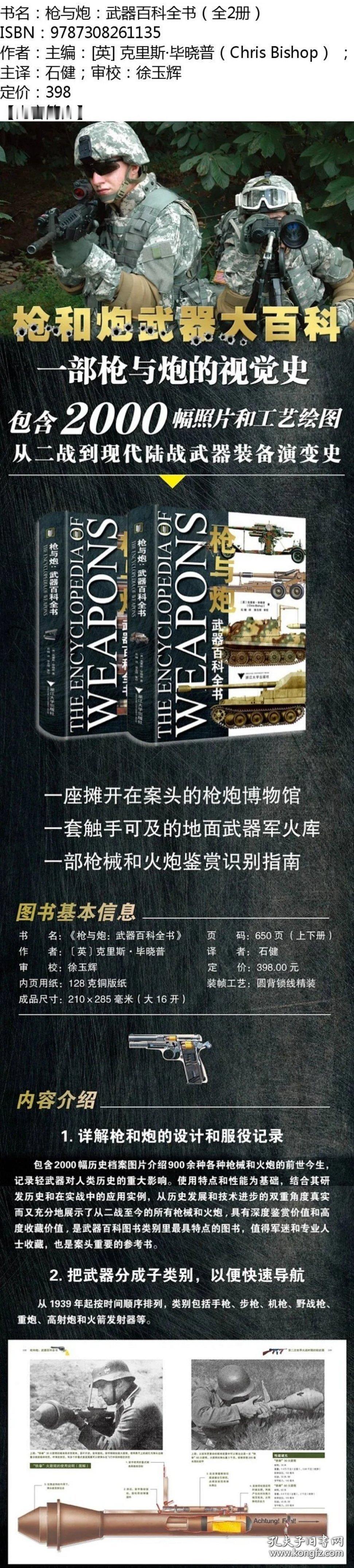 机枪、冲锋枪和其他轻武器以及各类型的火炮,以介绍它们的使用特点和性能为基础,结合其研发历史和在实战中的应用实例,从历史发展和技术进步的双重角度,真实而又充分地展示了从1914年至今的所有单兵武器,具有深度鉴赏价值和高度收藏价值,是武器百科图书类别里最具特点的图书,值得军迷和专业人士收藏,也是案头重要的参考书。-general-share?promotion_id=3799053924628037964