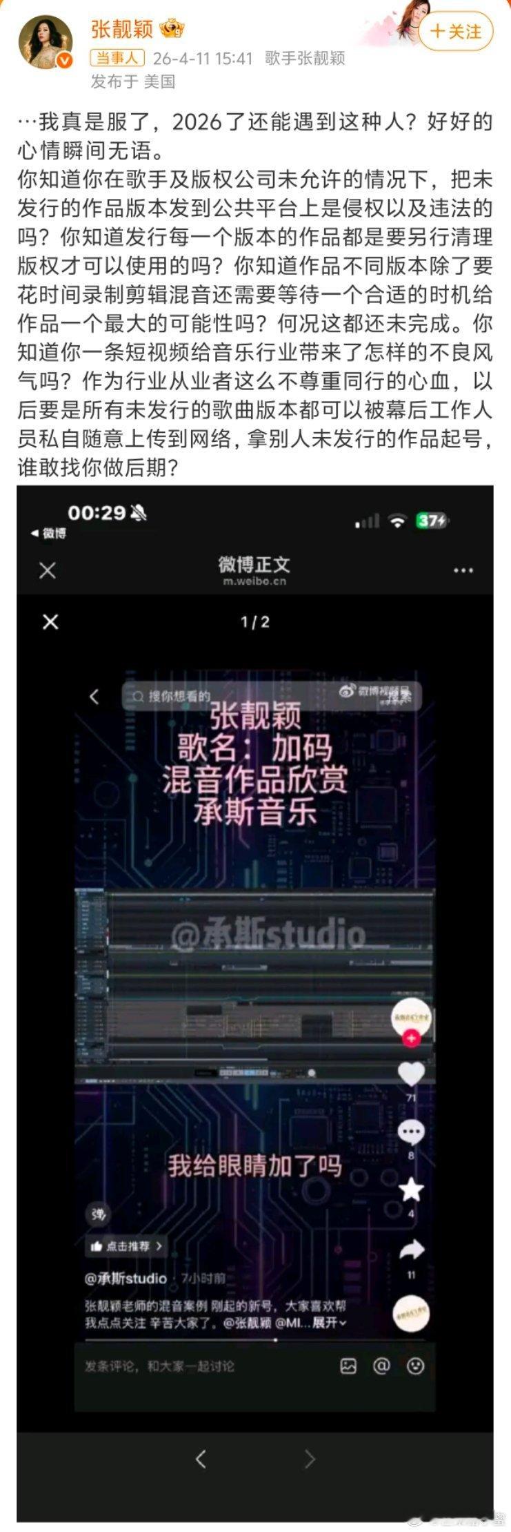张靓颖怒斥工作人员泄露未发行作品2026年4月11日,张靓颖发微博怒怼合作的承斯音乐工作室,对方未经授权,擅自把她还没做完、没发行的新歌《加码》混音版,以“作品欣赏”为名发到网上引流。她直指这种行为涉嫌违法侵权、破坏行业规则,连发问怒怼,也让大家都关注起音乐版权保护的问题