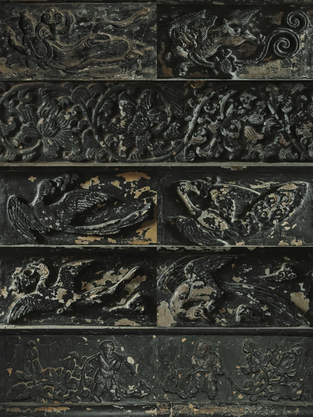 🧱内部每层须弥座上雕刻有近200方南宋砖雕,题材涵盖(开始报菜名):海石榴、荷叶花、宝相花、牡丹花、芙蓉花、鸡冠花、绣球花、月季花、山茶花、广玉兰;凤凰、孔雀、鹦鹉、山鹊;狮子、麟麟、獬豸、狻猊、仙鹿、犀牛;飞仙、嫔伽、乐伎;回纹、云纹、如意、团花、万字纹、钥匙头等。图案和北宋官方建筑典籍《营造法式》中的彩画制度高度吻合。