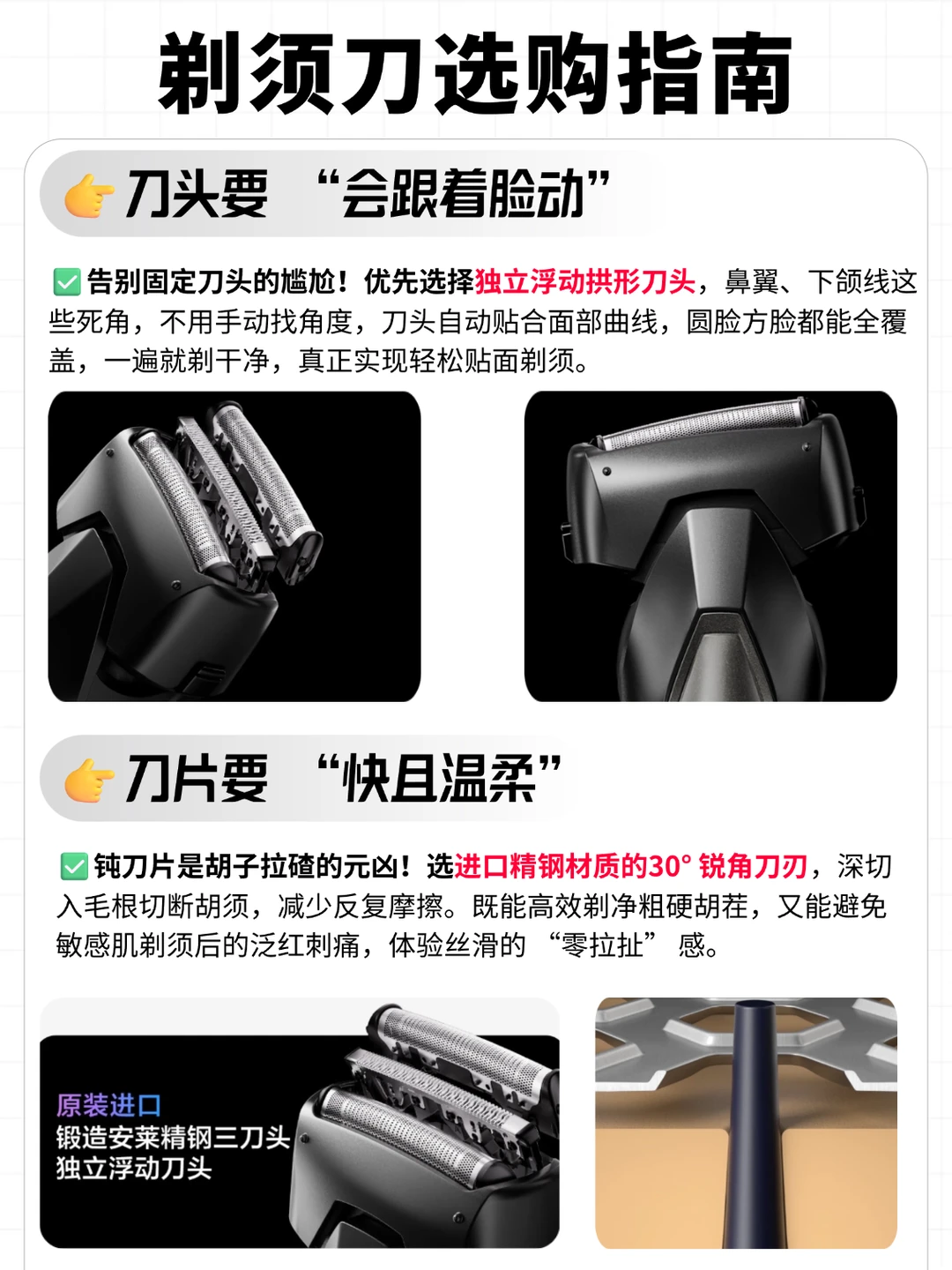 ✨ 死角克星:独立浮动拱形 3 刀头,像鼻翼、喉结、下颚线这些重灾区,它自己就能贴合面部曲线,一推就干净,不用你费力找角度反复摩擦。