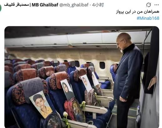 还有一幅画令人动容的照片,就是在飞机机舱里,伊朗首席谈判代表,外长卡列巴夫站立着,默默看着座椅上四个小女孩的照片,下面是她们的书包,旁边还摆放着一枝鲜花。