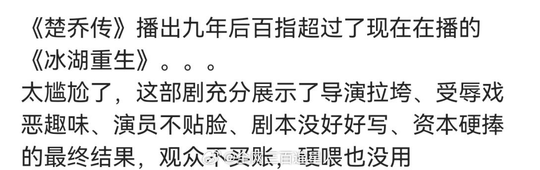 冰湖重生这部剧最大的作用可能就是让楚乔传被翻出来被夸了,知道第二部可能会不如第一
