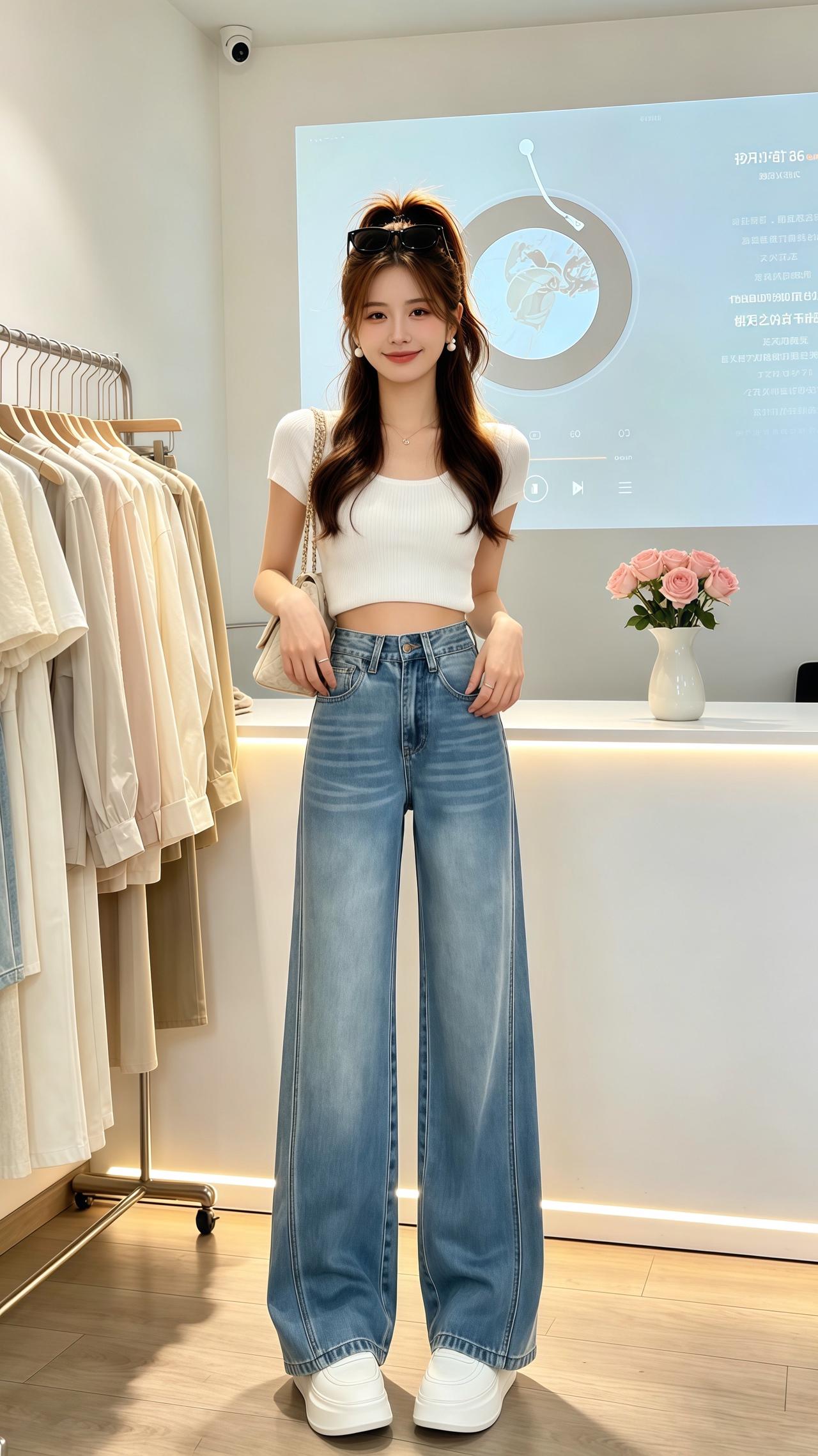 雨后的石板路泛着清润的光,她就站在那里,一身浅蓝色喇叭牛仔裤,把利落与温柔揉得刚