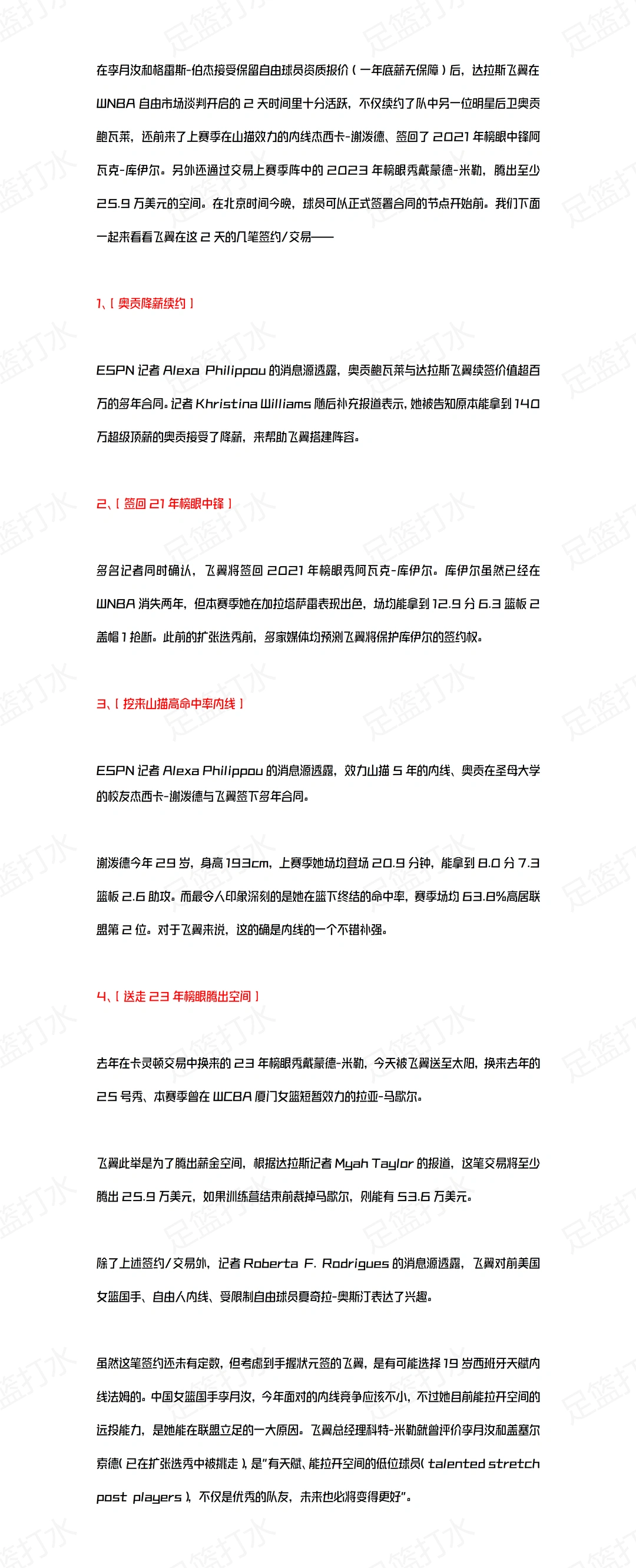 ESPN记者Alexa Philippou的消息源透露,奥贡与飞翼续签价值超百万的多年合同。记者Khristina Williams随后补充报道表示,她被告知原本能拿到140万超级顶薪的奥贡接受了降薪,来帮助飞翼搭建阵容。