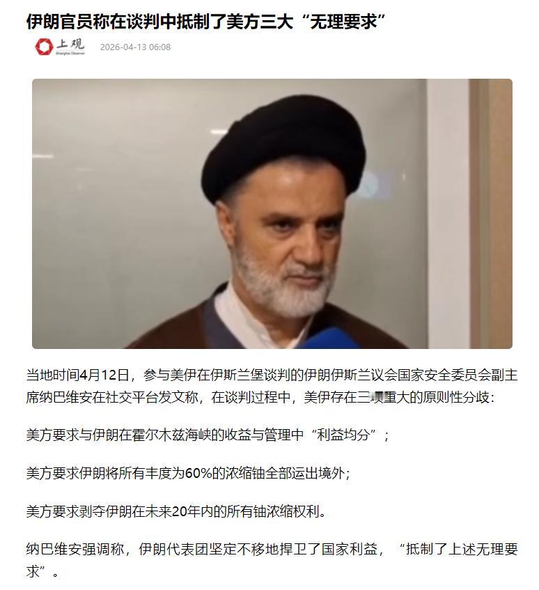 美方来了300人,阵仗不小,伊朗也来了70人,看得出来一开始都有诚意,可谈了24小时,最后不欢而散,问题就出在美国的三个无理要求上。