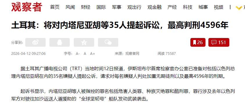 据媒体4月12日报道:最近土耳其出了个大新闻,简单说就是:伊斯坦布尔检察官办公室,要起诉以色列总理内塔尼亚胡等35个人,要求给每个人判加重无期徒刑,再加上最高4596年的有期徒刑。