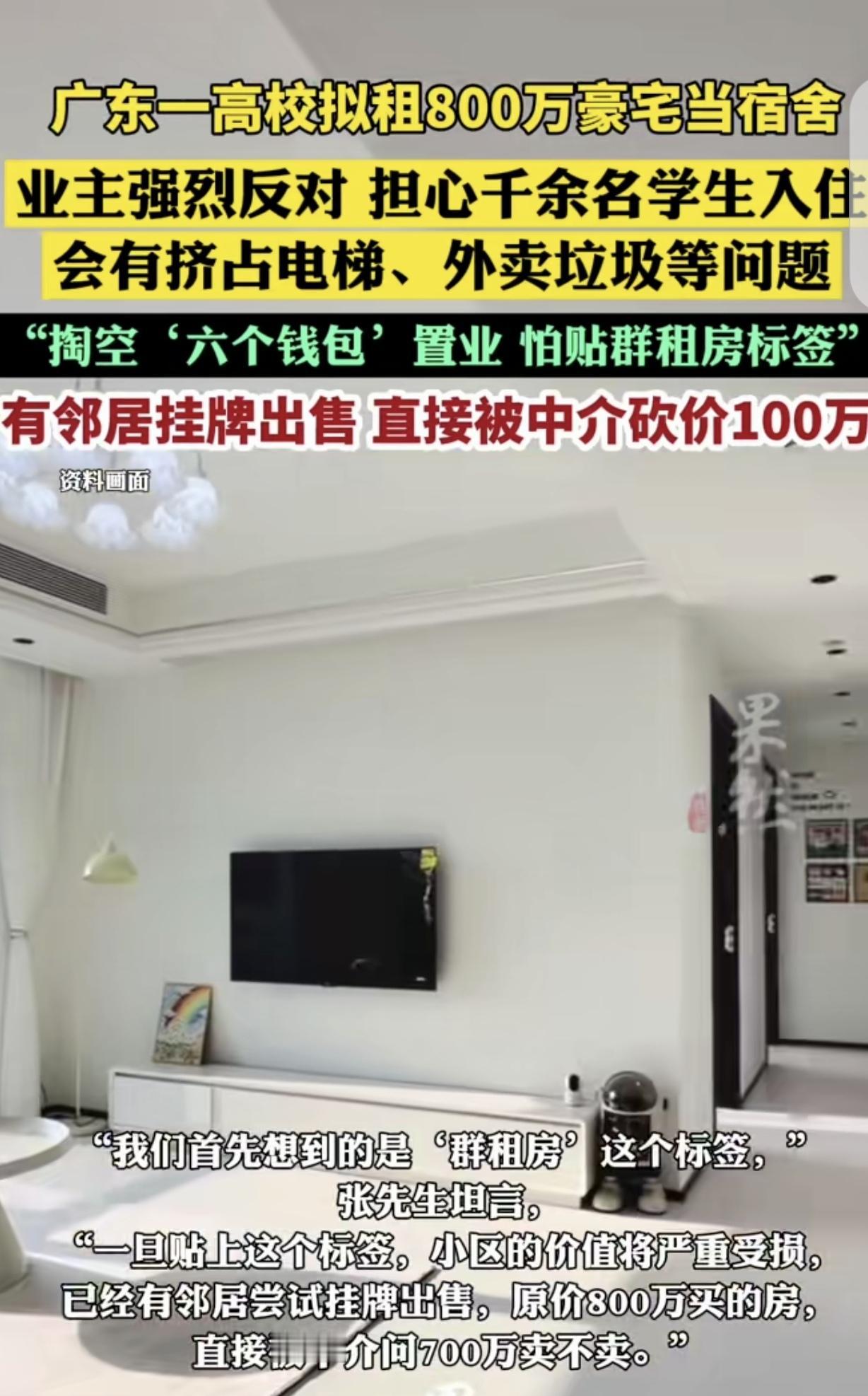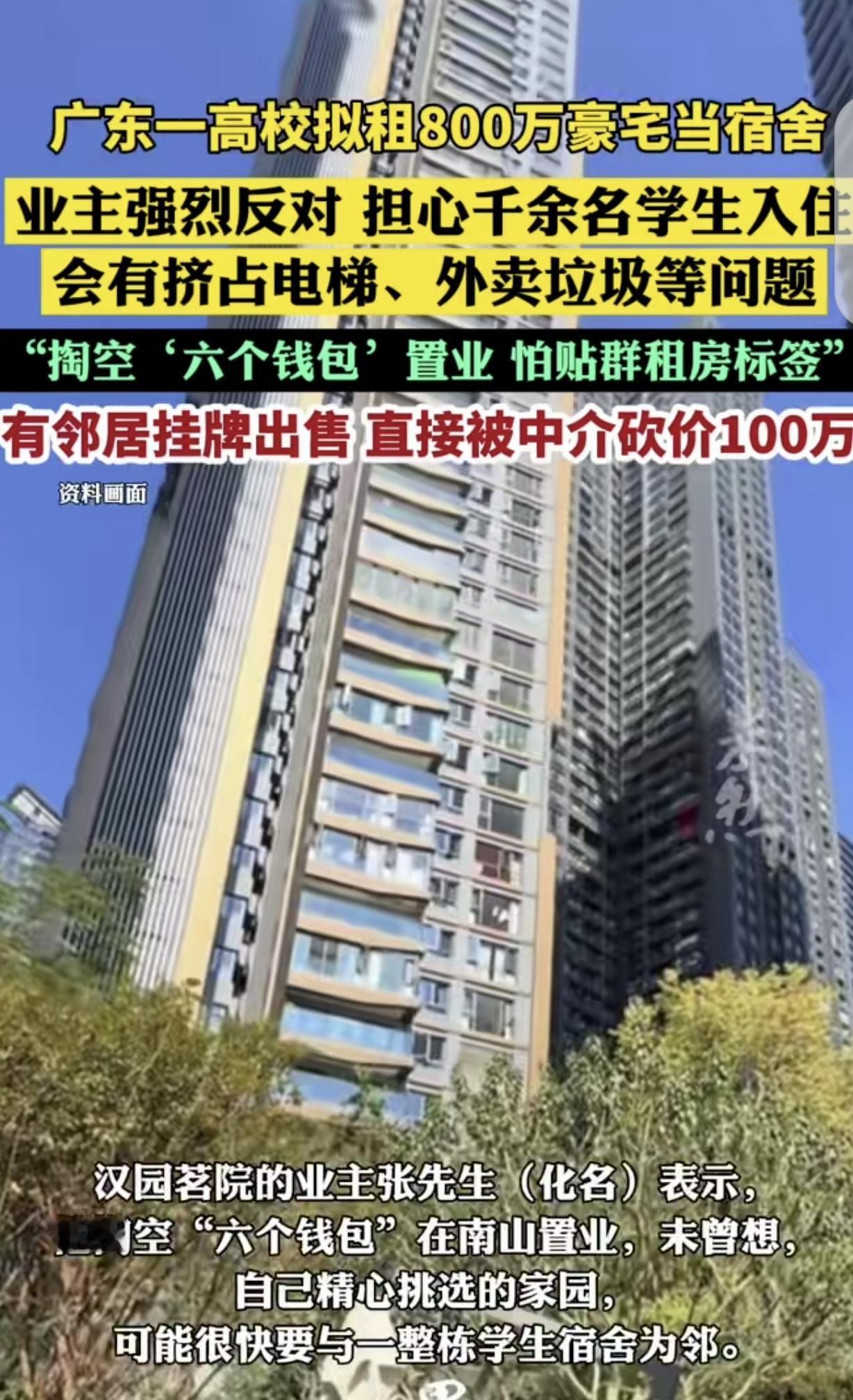 广东深圳,一男子掏空“6个钱包”,花800万买房,万万没想到,某学校却在他那栋楼,租800万豪宅,给学校1000多名研究生当宿舍,这些研究生不但会挤占电梯,还会一日三餐点外卖,而且,这栋楼还有被贴上“群租房标签”的风险,那房价就大打折扣,果不其然,一邻居受不了挂牌出售,800万的房子,中介直接问700万卖不卖?一下子砍掉100万。所有业主都怒了。